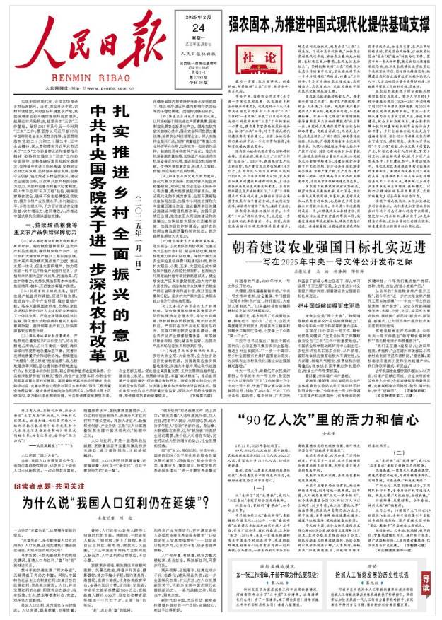 中共中央、國(guó)務(wù)院公開(kāi)發(fā)布《關(guān)于進(jìn)一步深化農(nóng)村改革 扎實(shí)推進(jìn)鄉(xiāng)村全面振興的意見(jiàn)》。這是黨的十八大以來(lái)中央連續(xù)發(fā)出的第十三個(gè)指導(dǎo)“三農(nóng)”工作的“一號(hào)文件”,體現(xiàn)了以習(xí)近平同志為核心的黨中央對(duì)“三農(nóng)”工作的重視一以貫之,強(qiáng)農(nóng)惠農(nóng)富農(nóng)的政策持續(xù)加力。抓好“三農(nóng)”工作,對(duì)于中國(guó)式現(xiàn)代化建設(shè)具有重要意義。當(dāng)前,各地區(qū)各部門(mén)要抓好中央一號(hào)文件貫徹落實(shí),采取有效措施強(qiáng)農(nóng)固本。