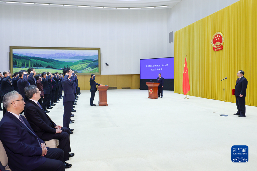 宣誓后,國務(wù)院總理李強(qiáng)作了講話。他強(qiáng)調(diào),誓詞雖短,但字字千鈞,希望大家把錚錚誓言銘記于心、踐之于行,忠于憲法、忠于祖國、忠于人民,不辜負(fù)黨和人民的重托。要堅(jiān)持用習(xí)近平新時(shí)代中國特色社會(huì)主義思想凝心鑄魂,深刻領(lǐng)悟“兩個(gè)確立”的決定性意義,堅(jiān)決做到“兩個(gè)維護(hù)”,不斷提高政治判斷力、政治領(lǐng)悟力、政治執(zhí)行力,當(dāng)好貫徹黨中央決策部署的執(zhí)行者、行動(dòng)派、實(shí)干家。要倍加珍惜黨和人民賦予的平臺(tái),以奮發(fā)有為的精神狀態(tài)干事創(chuàng)業(yè),緊緊圍繞推進(jìn)高質(zhì)量發(fā)展這個(gè)首要任務(wù),持續(xù)深化改革、擴(kuò)大開放、推動(dòng)創(chuàng)新、改善民生,勇于打破常規(guī),善于開辟新局,抓住主要矛盾綜合施策,聚焦瓶頸制約持續(xù)攻堅(jiān),以實(shí)干實(shí)績踐行誓言。要牢固樹立正確的權(quán)力觀、政績觀、事業(yè)觀,嚴(yán)格按照法定權(quán)限和程序履行職責(zé)、行使權(quán)力、承擔(dān)責(zé)任,始終繃緊廉潔自律這根弦,時(shí)時(shí)處處嚴(yán)格要求自己,堅(jiān)決反對(duì)形式主義、官僚主義,大力弘揚(yáng)勤儉節(jié)約、艱苦奮斗的優(yōu)良作風(fēng),為全面建設(shè)社會(huì)主義現(xiàn)代化國家、實(shí)現(xiàn)中華民族偉大復(fù)興中國夢(mèng)不懈奮斗。
