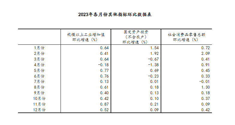 (2)根據(jù)季節(jié)調(diào)整模型自動(dòng)修正結(jié)果,對近一年來各期國內(nèi)生產(chǎn)總值、規(guī)模以上工業(yè)增加值、固定資產(chǎn)投資(不含農(nóng)戶)、社會(huì)消費(fèi)品零售總額環(huán)比增速進(jìn)行修訂。修訂結(jié)果及2023年四季度GDP環(huán)比數(shù)據(jù)、2023年12月份其他指標(biāo)環(huán)比數(shù)據(jù)如下: