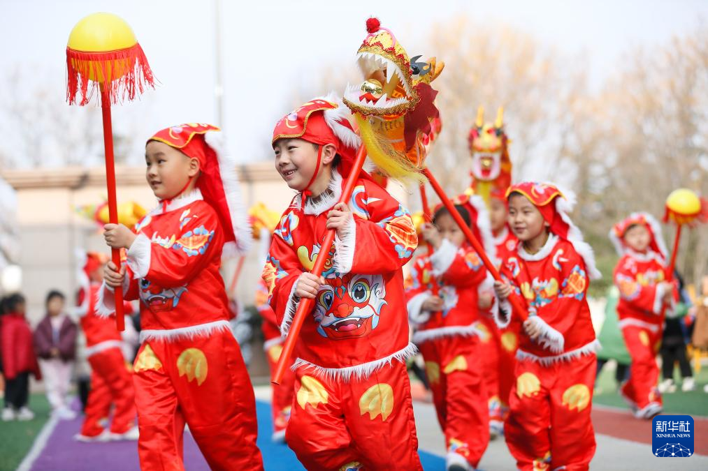 3月11日,山東省青島市即墨區(qū)龍山中心幼兒園的孩子們在進行舞龍表演。