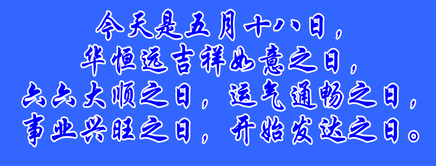 今天是五月十八日,華恒遠(yuǎn)吉祥如意之日,六六大順之日,運(yùn)氣通暢之日,事業(yè)興旺之日,開(kāi)始發(fā)達(dá)之日。