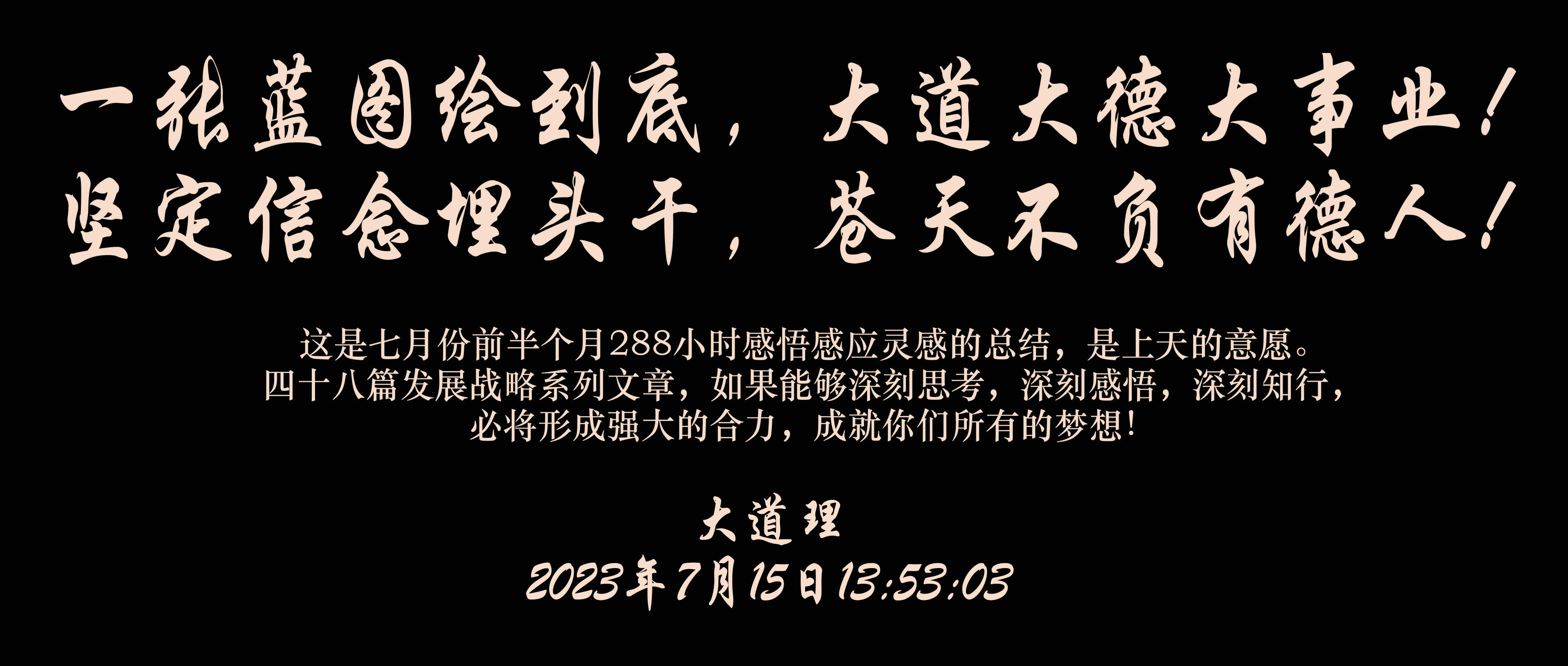 這是七月份前半個月288小時感悟感應(yīng)靈感的總結(jié),是上天的意愿。四十八篇發(fā)展戰(zhàn)略系列文章,如果能夠深刻思考,深刻感悟,深刻知行,必將形成強(qiáng)大的合力,成就你們所有的夢想!