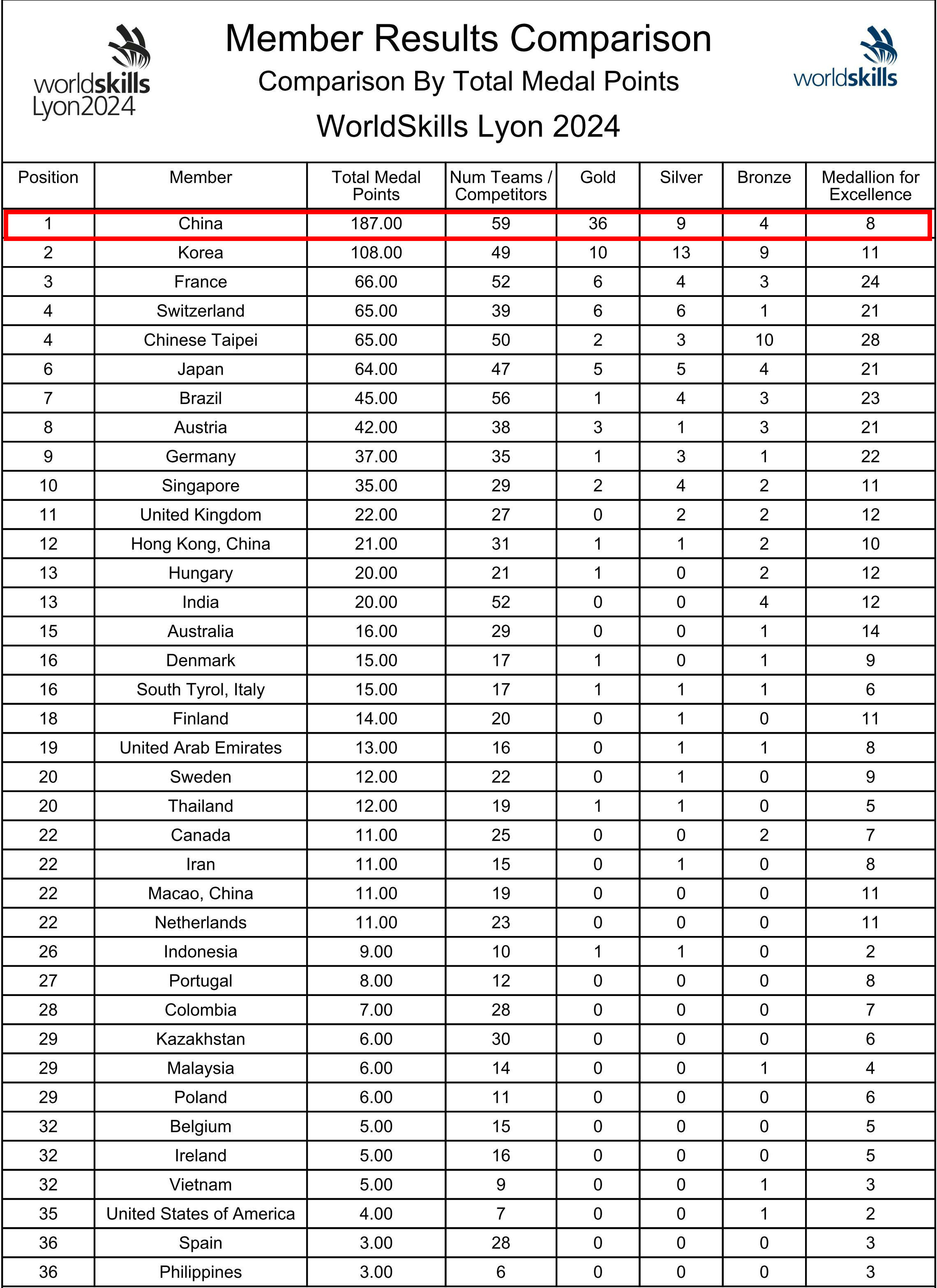 新華社法國(guó)里昂9月15日電 第47屆世界技能大賽15日晚在法國(guó)里昂閉幕,中國(guó)代表團(tuán)在本次大賽中表現(xiàn)出色,在全部59個(gè)項(xiàng)目中,共獲得36枚金牌、9枚銀牌、4枚銅牌和8個(gè)優(yōu)勝獎(jiǎng),位居金牌榜、獎(jiǎng)牌榜和團(tuán)體總分首位。