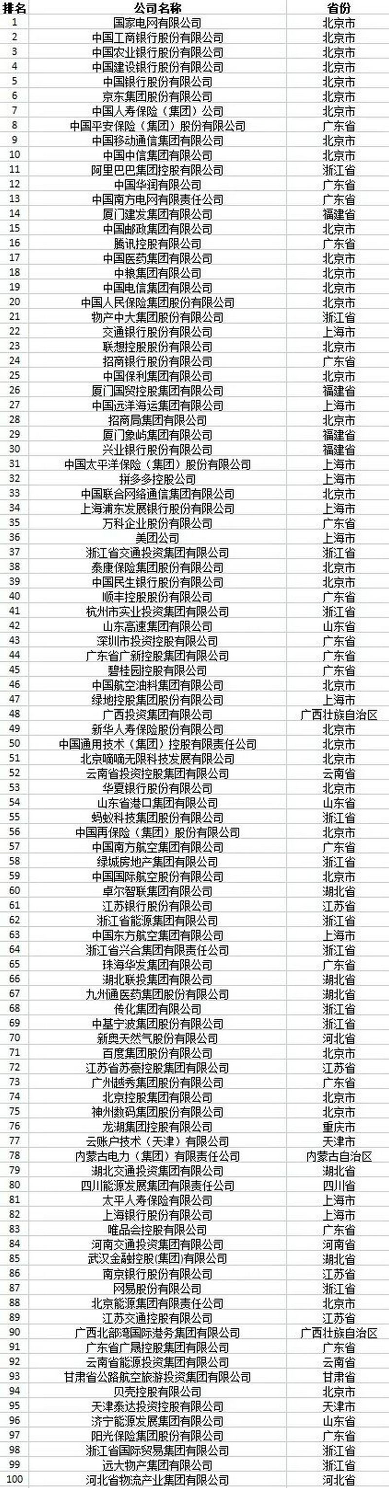 位列榜單前10位的企業(yè)分別是:國家電網(wǎng)有限公司、中國工商銀行股份有限公司、中國農(nóng)業(yè)銀行股份有限公司、中國建設銀行股份有限公司、中國銀行股份有限公司、京東集團股份有限公司、中國人壽保險(集團)公司、中國平安保險(集團)股份有限公司、中國移動通信集團有限公司和中國中信集團有限公司。