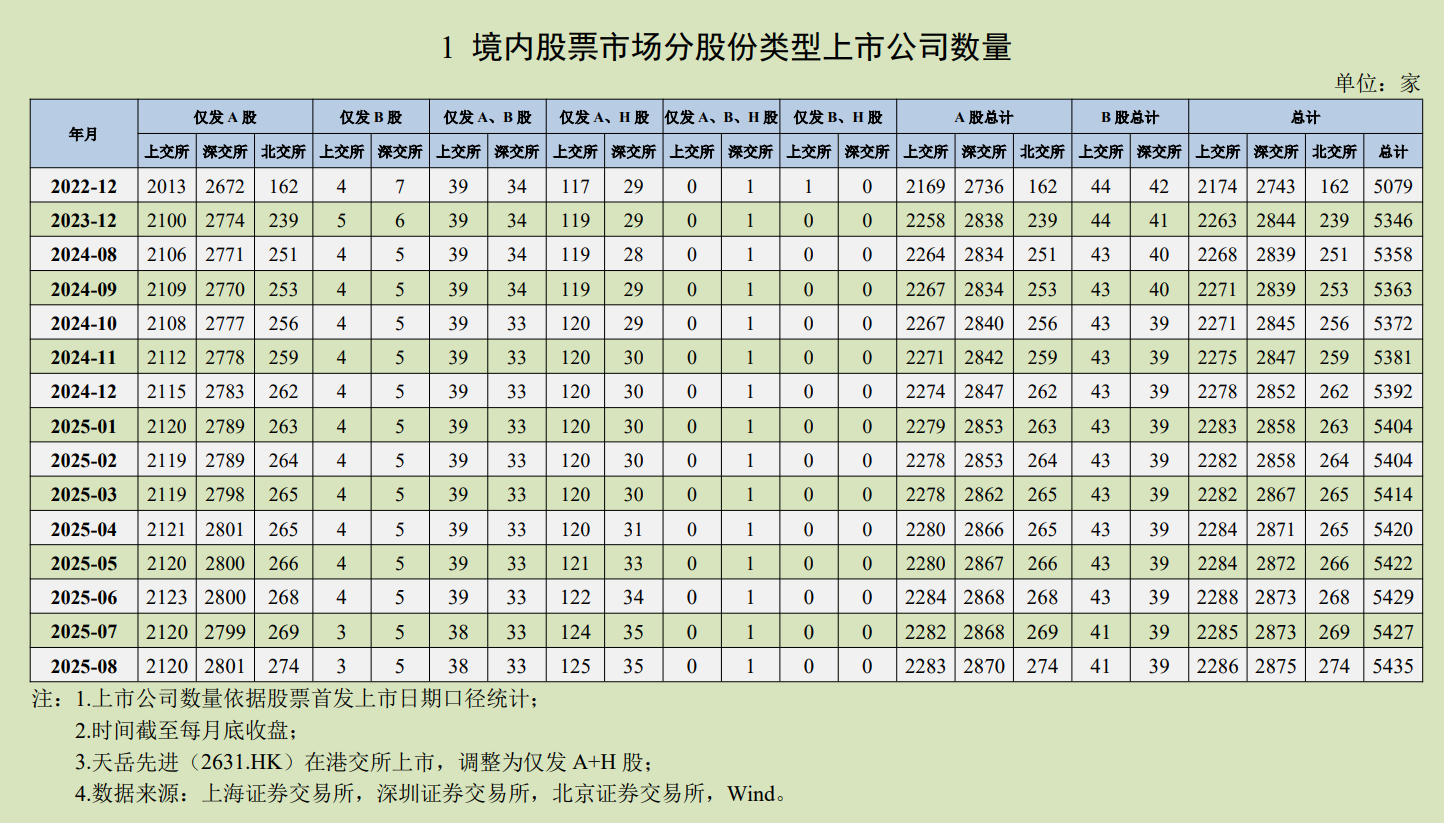 中國上市公司協(xié)會最新發(fā)布的數(shù)據(jù)顯示,截至2025年8月31日,境內(nèi)股票市場共有上市公司5435家,滬、深、北證券交易所分別為2286、2875、274家。