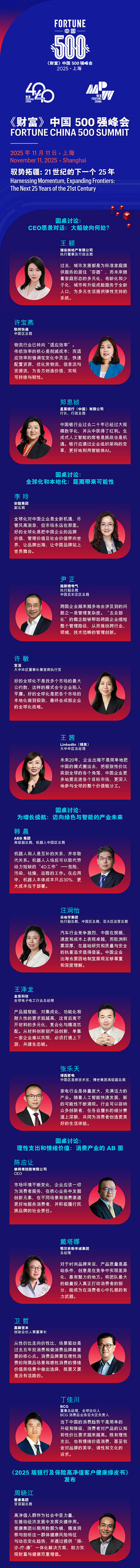 11月11日,2025年《財富》中國500強峰會在上海成功舉辦。以“馭勢拓疆:21世紀的下一個25年”為主題的本次峰會,匯聚了500強公司領導者、最具創(chuàng)新精神的企業(yè)領袖和專家學者,深入探討企業(yè)如何在新秩序塑造的進程中,引領并定義一條融合智能、韌性與可持續(xù)的未來之路。