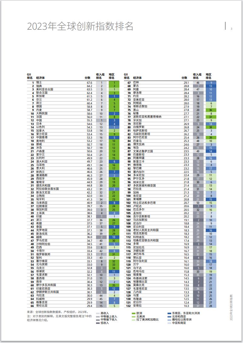 GII排名 經(jīng)濟體 分數(shù) 收入組排名 地區(qū)排名 年度
