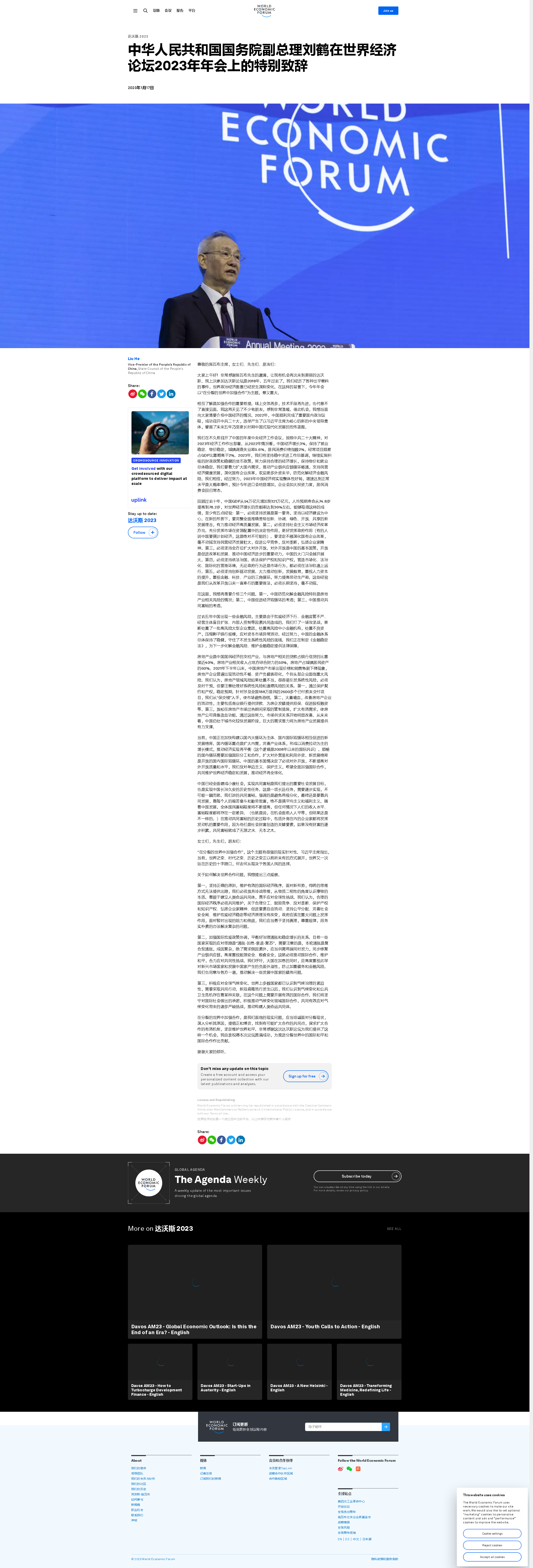 中華人民共和國國務(wù)院副總理劉鶴在世界經(jīng)濟(jì)論壇2023年年會上的特別致辭