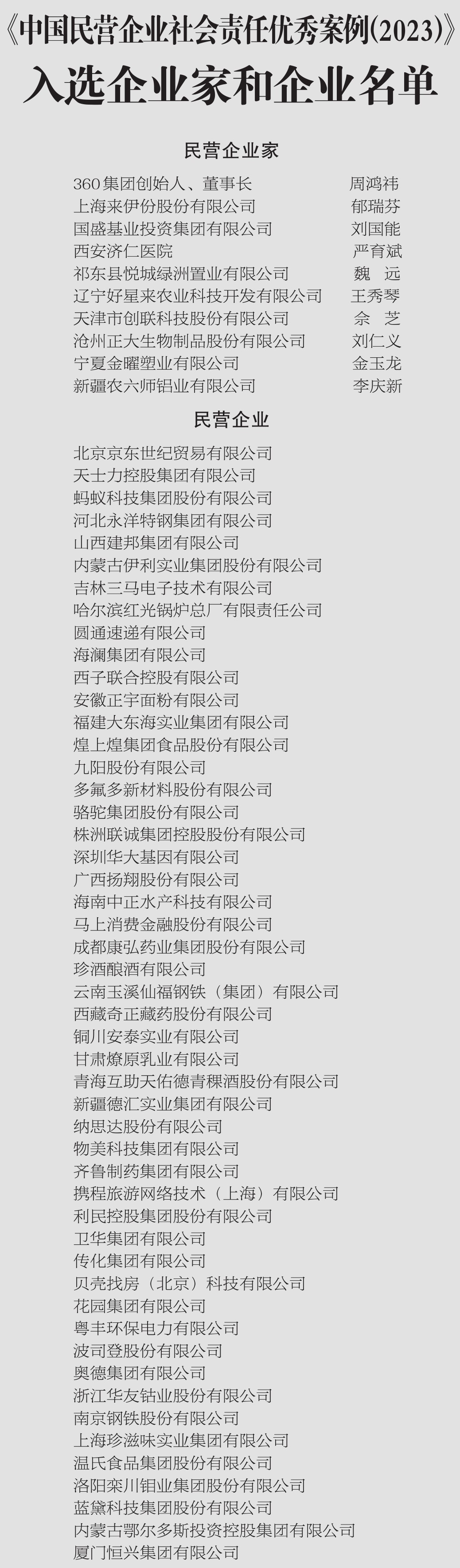 會上,發(fā)布了《中國民營企業(yè)社會責任優(yōu)秀案例(2023)》,360集團創(chuàng)始人、董事長周鴻祎等10位民營企業(yè)家和北京京東世紀貿(mào)易有限公司等50家民營企業(yè)入選2023年中國民營企業(yè)社會責任優(yōu)秀案例。(相關(guān)報道見02版)