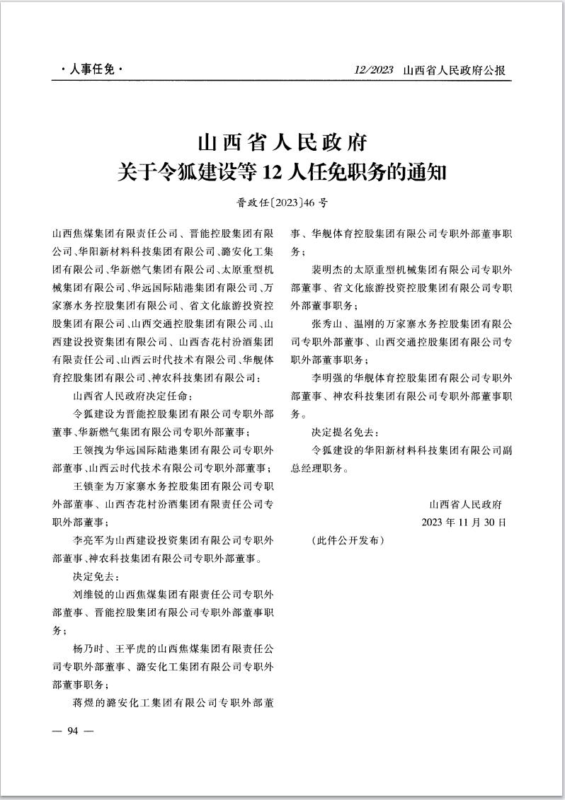 同時,決定免去劉維銳的山西焦煤集團專職外部董事、晉能控股集團專職外部董事職務(wù);楊乃時、王平虎的山西焦煤集團專職外部董事、潞安化工集團專職外部董事職務(wù);蔣煜的潞安化工集團專職外部董事、華艦體育控股集團專職外部董事職務(wù);裴明杰的太重集團專職外部董事、省文旅集團專職外部董事職務(wù);張秀山、溫剛的萬家寨水控集團專職外部董事、山西交控集團專職外部董事職務(wù);李明強的華艦體育控股集團專職外部董事、神農(nóng)科技集團專職外部董事職務(wù),并決定提名免去令狐建設(shè)的華陽集團副總經(jīng)理職務(wù)。