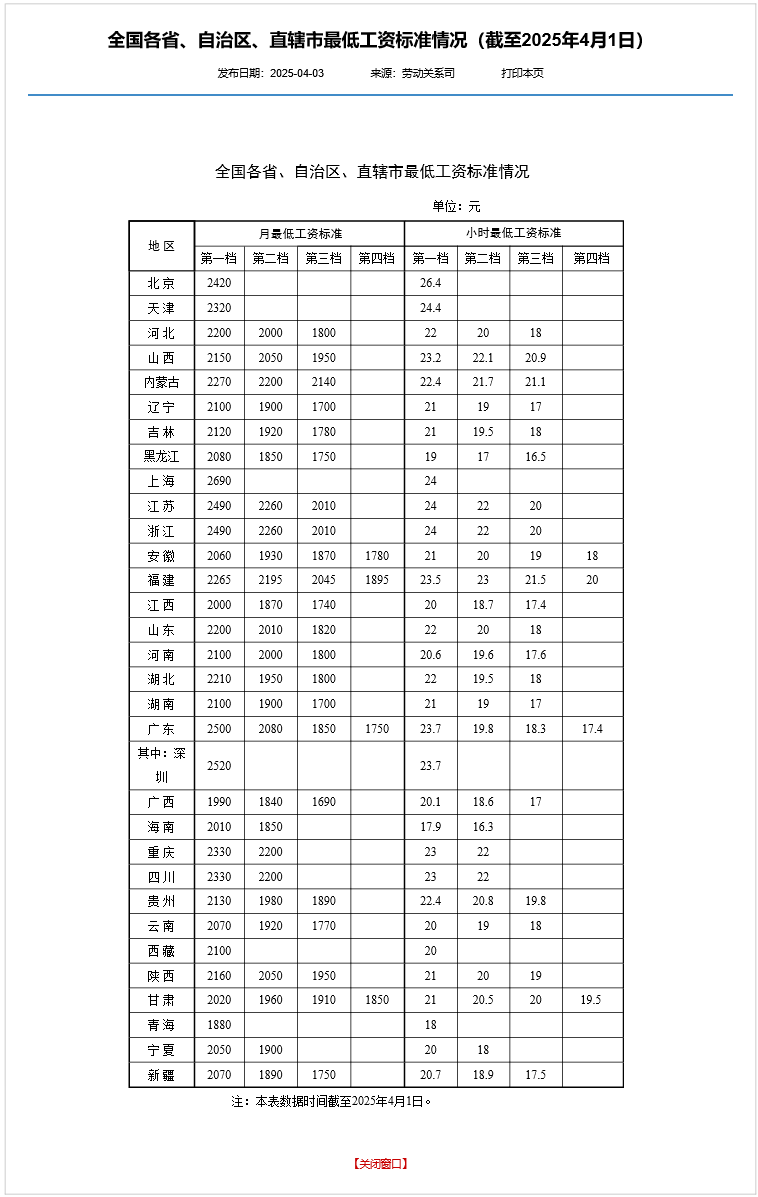 全國(guó)各省、自治區(qū)、直轄市最低工資標(biāo)準(zhǔn)情況(截至2025年4月1日)