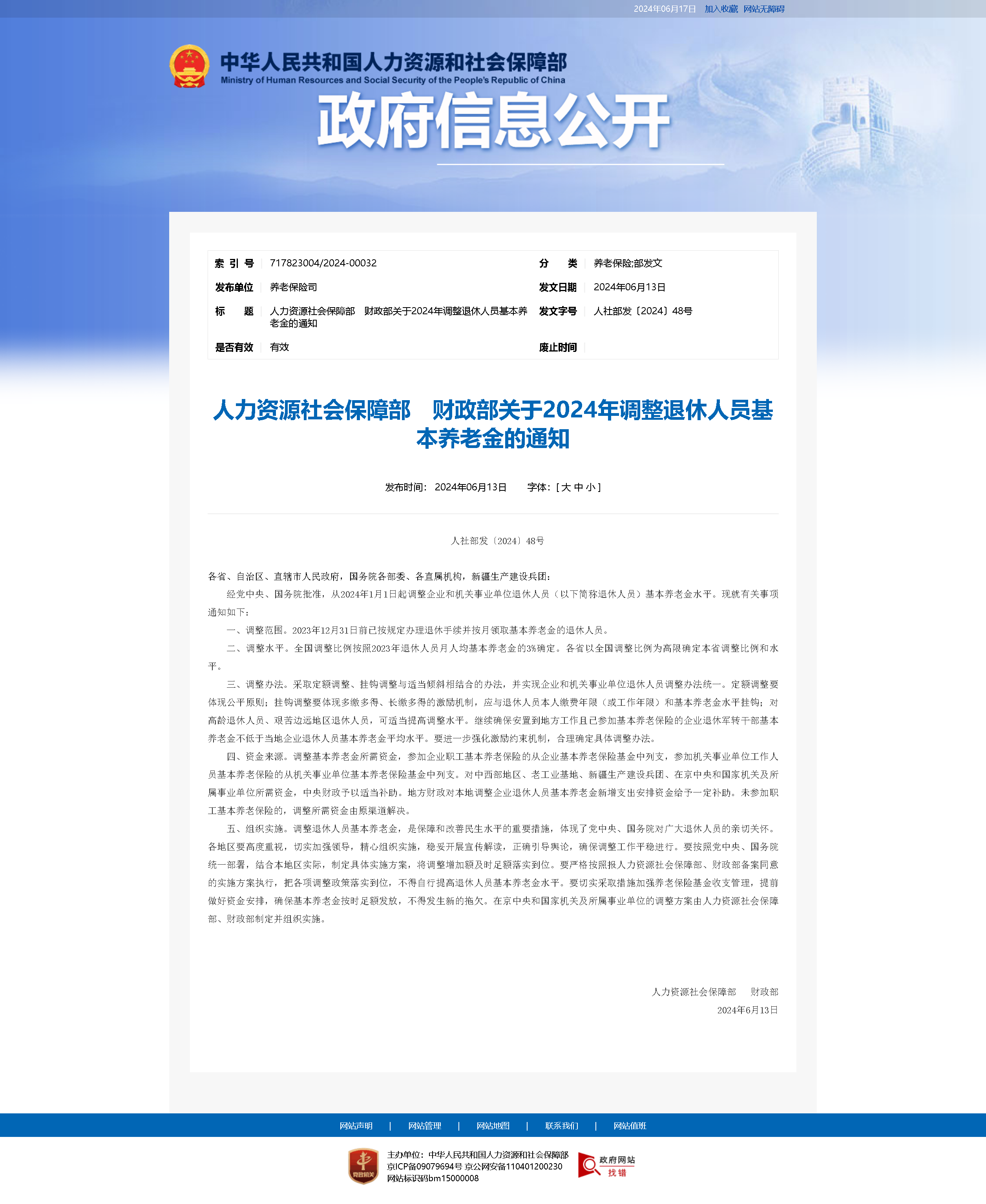 人力資源社會保障部 財政部關于2023年調整退休人員基本養(yǎng)老金的通知