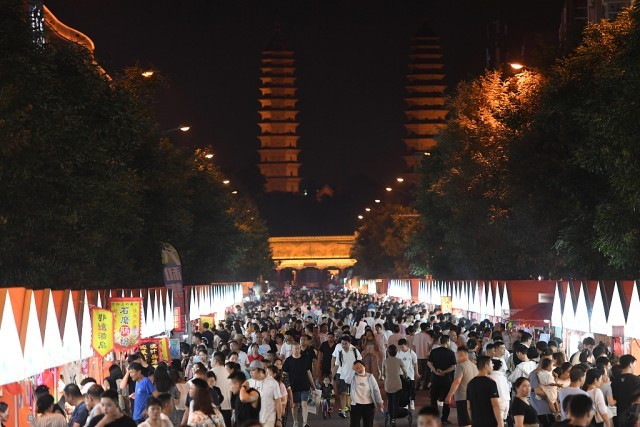2024年7月16日,山西太原,雙塔寺前人山人海。豐富多彩的夜間主題活動(dòng),滿(mǎn)足人們舒適納涼的需求,進(jìn)一步催熱“夏日夜經(jīng)濟(jì)”。視覺(jué)中國(guó) 資料圖