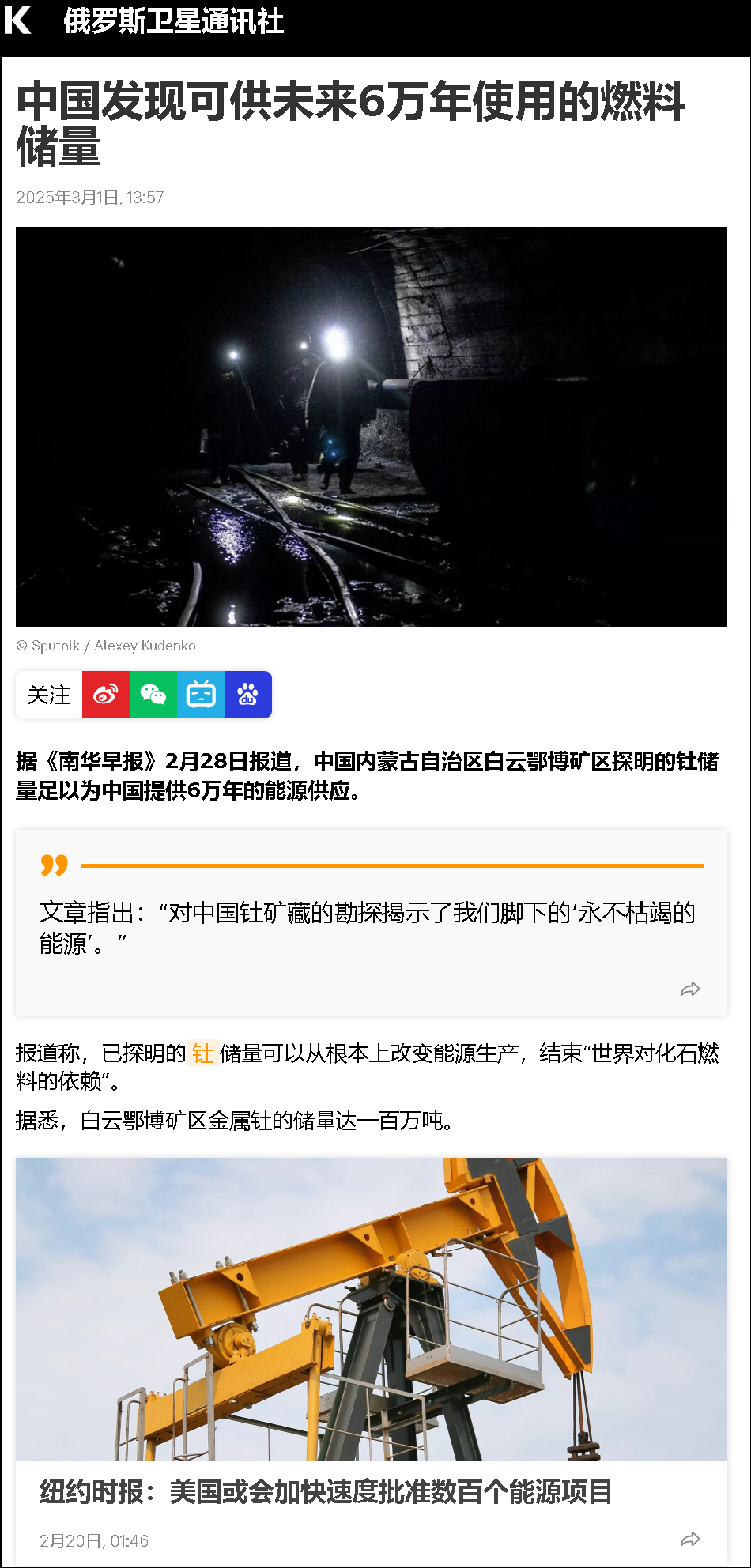 文章指出:“對中國釷礦藏的勘探揭示了我們腳下的‘永不枯竭的能源’?!?