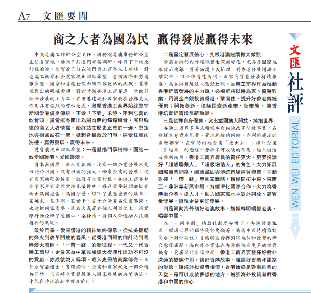 中央港澳工作辦公室主任、國(guó)務(wù)院港澳事務(wù)辦公室主任夏寶龍一連六日到澳門(mén)考察調(diào)研,昨日下午結(jié)束行程離澳。夏寶龍日前在澳門(mén)與工商界人士座談,對(duì)港澳工商界和企業(yè)家提出四點(diǎn)希望。當(dāng)前國(guó)際形勢(shì)復(fù)雜多變,國(guó)家和香港發(fā)展面臨不容低估的挑戰(zhàn),夏寶龍?zhí)岢龅拿鞔_希望,對(duì)新時(shí)期香港工商界進(jìn)一步做好經(jīng)濟(jì)發(fā)展的主力軍、在香港建設(shè)和國(guó)家發(fā)展發(fā)揮更大作用具有強(qiáng)烈的啟示意義,激勵(lì)香港工商界始終堅(jiān)守愛(ài)國(guó)愛(ài)港優(yōu)良傳統(tǒng),不做「下跪」求饒、逐利忘義的軟骨頭,勇當(dāng)挺身而出為國(guó)為民的錚錚鐵骨,展現(xiàn)胸懷的商之大者情操,始終站在歷史正確的一邊、堅(jiān)定地與祖國(guó)站在一起,挺起脊梁敢于斗爭(zhēng),經(jīng)受住風(fēng)雨洗禮,贏(yíng)得發(fā)展、贏(yíng)得未來(lái)。