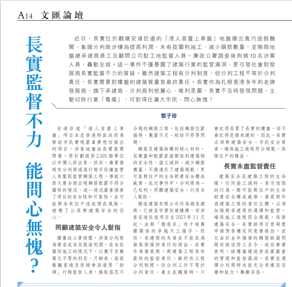 近日,長實位于觀塘安達(dá)臣道的「港人首置上車盤」地盤爆出貪污造假丑聞,扎鐵分判商涉嫌為提高利潤,未有按圖則施工,減少鋼筋數(shù)量,并賄賂地盤總承建商員工及顧問公司駐工地監(jiān)督人員。廉政公署調(diào)查后拘捕10名涉案人員,轟動全城。這一事件不僅暴露了建筑行業(yè)的監(jiān)管漏洞,更引發(fā)社會對發(fā)展商長實監(jiān)督不力的質(zhì)疑。雖然建筑工程有分判制度,但分判工程不等于分判責(zé)任,長實需要對樓盤的建筑質(zhì)量負(fù)最終責(zé)任。長實作為扎根香港多年的老牌發(fā)展商,旗下承建商、分判商利欲薰心、唯利是圖,長實不及時發(fā)現(xiàn)問題、主動切除行業(yè)「毒瘤」,可對得住廣大市民、問心無愧?