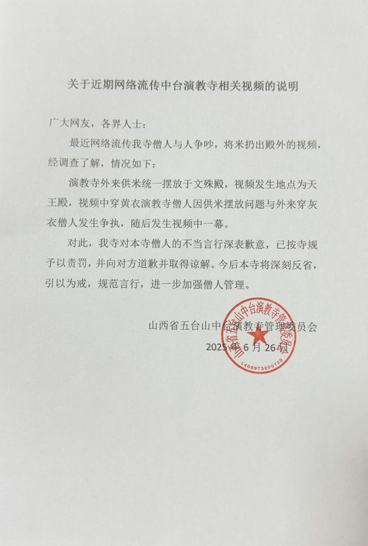根據(jù)調(diào)查結(jié)果,五臺山風景名勝區(qū)統(tǒng)戰(zhàn)宗教局和五臺山佛教協(xié)會依據(jù)《宗教事務條例》及佛教教規(guī),對中臺演教寺負責人釋某泯給予警告處分和勸誡懲處,對涉事僧人釋某道予以起單離寺處分,現(xiàn)釋某道已離開五臺山,勸返回老家;同時五臺山佛教協(xié)會發(fā)布了《關于文明接待來山信眾的倡議書》,要求景區(qū)各寺院加強僧人管理,文明接待游客信眾。