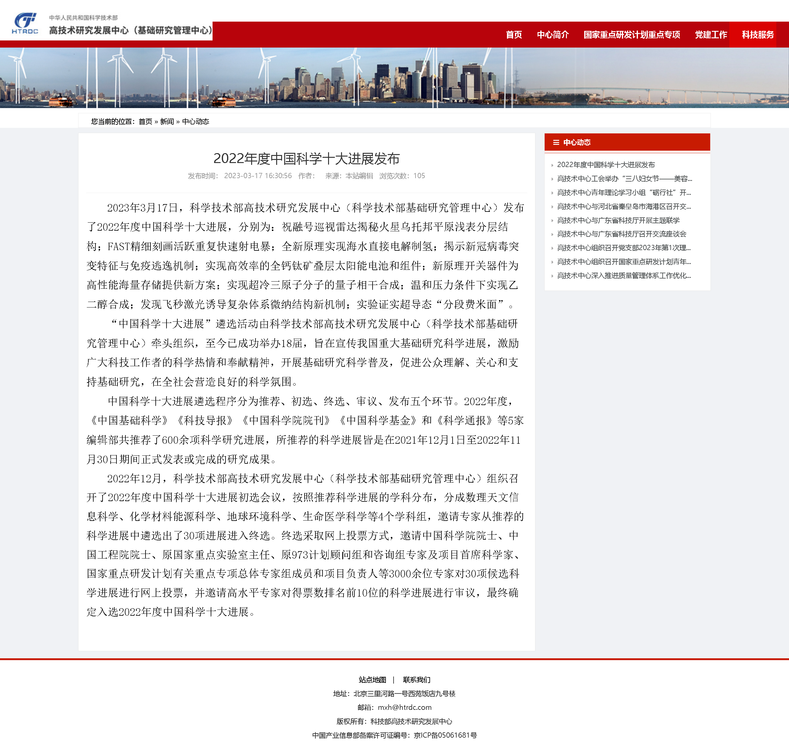 科學(xué)技術(shù)部高技術(shù)研究發(fā)展中心(科學(xué)技術(shù)部基礎(chǔ)研究管理中心)于17日發(fā)布2022年度中國(guó)科學(xué)十大進(jìn)展,分別為:祝融號(hào)巡視雷達(dá)揭秘火星烏托邦平原淺表分層結(jié)構(gòu);FAST精細(xì)刻畫活躍重復(fù)快速射電暴;全新原理實(shí)現(xiàn)海水直接電解制氫;揭示新冠病毒突變特征與免疫逃逸機(jī)制;實(shí)現(xiàn)高效率的全鈣鈦礦疊層太陽(yáng)能電池和組件;新原理開關(guān)器件為高性能海量存儲(chǔ)提供新方案;實(shí)現(xiàn)超冷三原子分子的量子相干合成;溫和壓力條件下實(shí)現(xiàn)乙二醇合成;發(fā)現(xiàn)飛秒激光誘導(dǎo)復(fù)雜體系微納結(jié)構(gòu)新機(jī)制;實(shí)驗(yàn)證實(shí)超導(dǎo)態(tài)“分段費(fèi)米面”。