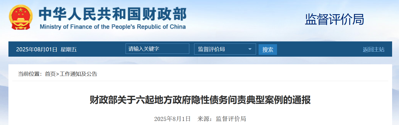 8月1日,財(cái)政部監(jiān)督評(píng)價(jià)局就六起地方政府隱性債務(wù)問責(zé)典型案例發(fā)布通報(bào):