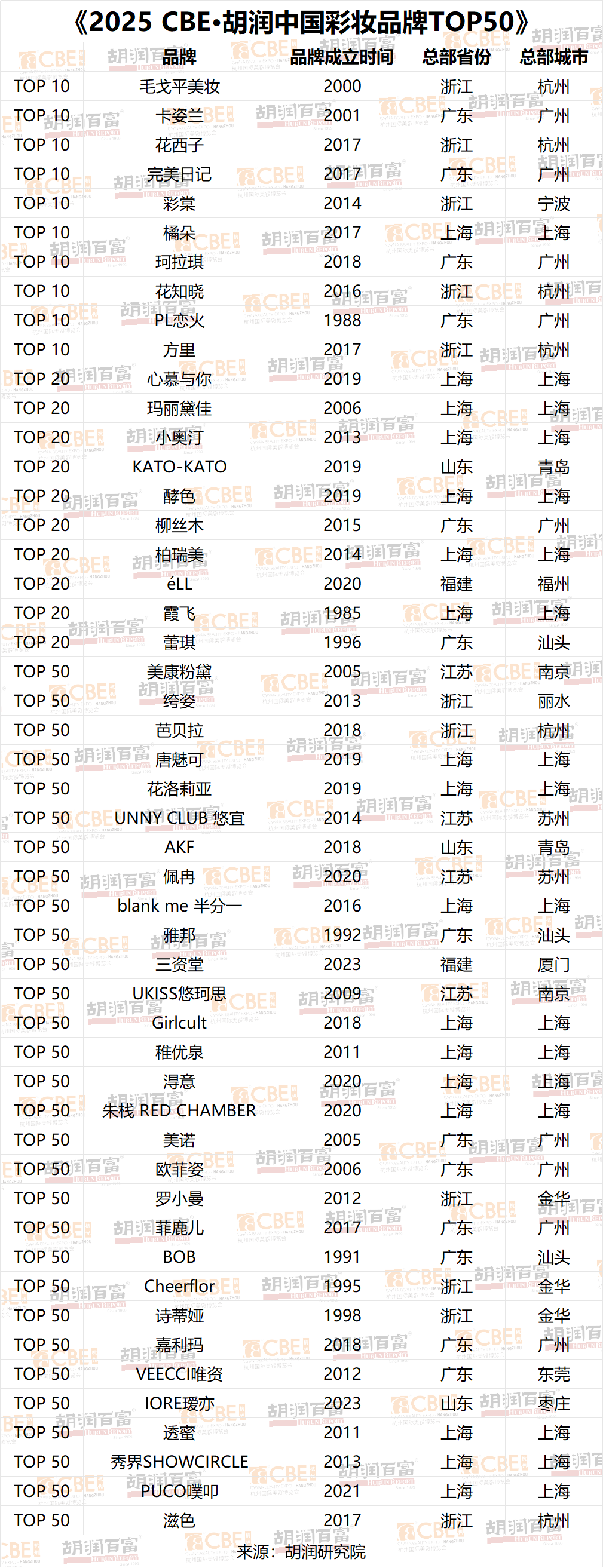 毛戈平美妝、卡姿蘭、花西子、完美日記、彩棠、橘朵、珂拉琪、花知曉、PL戀火、方里榮登“2025 CBE·胡潤中國彩妝品牌TOP10”