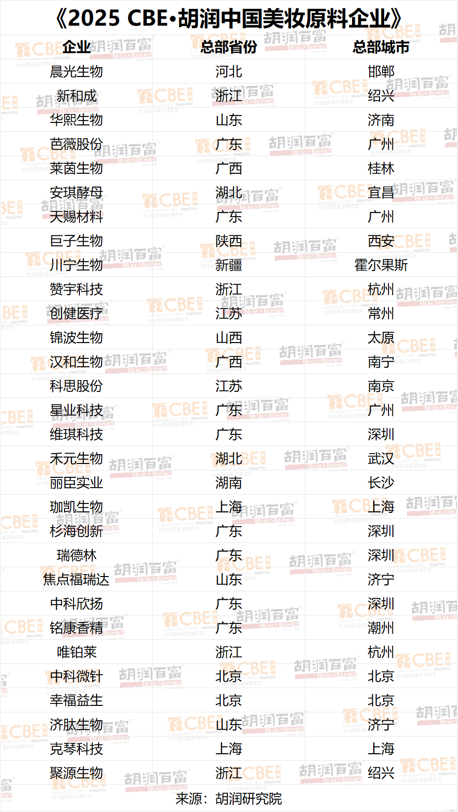 晨光生物、新和成、華熙生物等入選《2025 CBE·胡潤中國美妝原料企業(yè)》