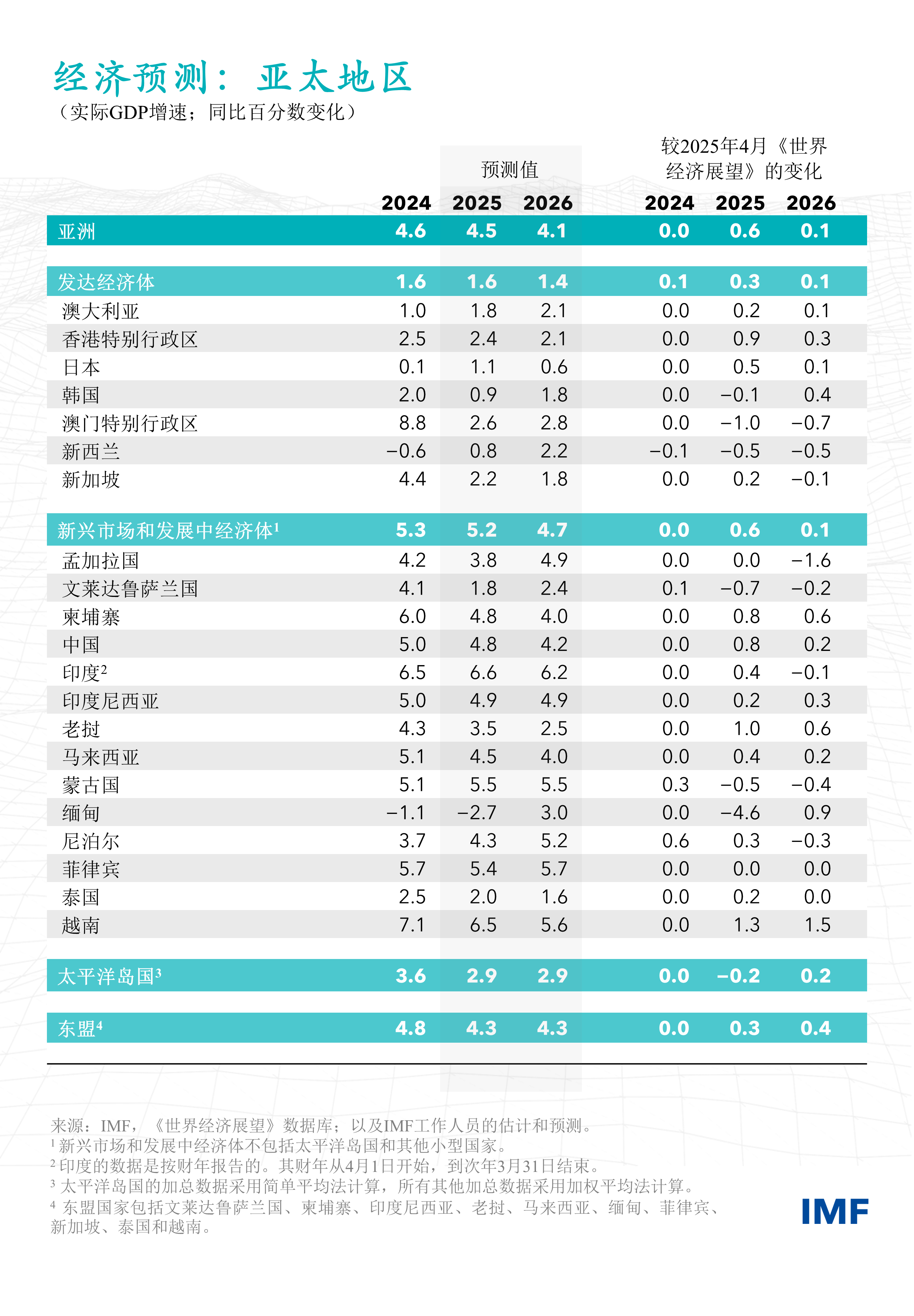 報(bào)告指出,2025年上半年,亞太地區(qū)的經(jīng)濟(jì)增長(zhǎng)得益于強(qiáng)勁的出口以及繁榮的技術(shù)周期。在全球金融環(huán)境寬松、美元貶值的背景下,亞太地區(qū)的寬松貨幣和財(cái)政政策進(jìn)一步支持內(nèi)需。從上行方面來看,當(dāng)前人工智能驅(qū)動(dòng)的投資熱潮對(duì)該地區(qū)出口、投資和生產(chǎn)率的提振力度可能強(qiáng)于預(yù)期。