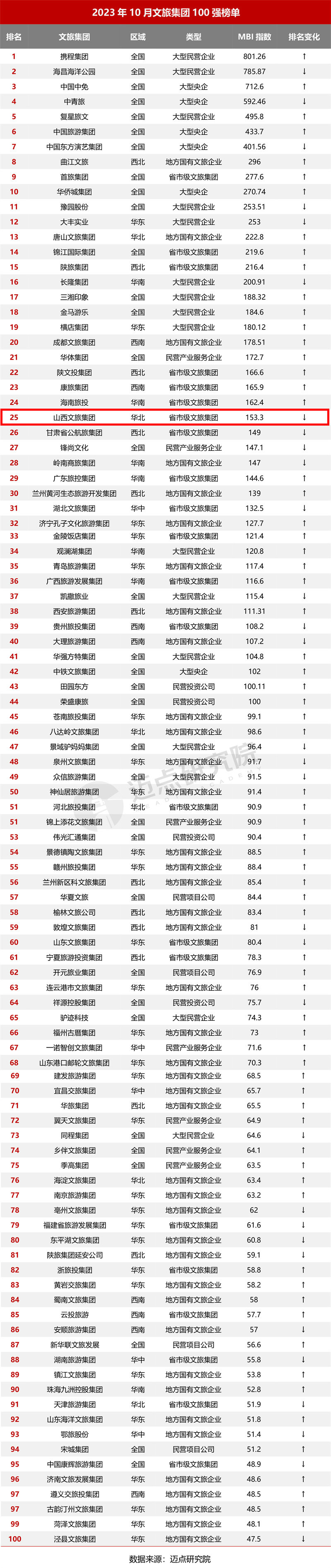 近日,“2023年10月文旅集團(tuán)全國(guó)100強(qiáng)榜單”出爐,山西文旅集團(tuán)榜上有名,居第25位。