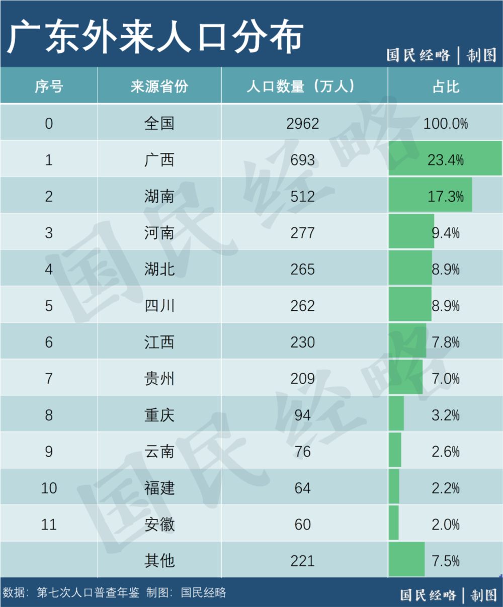七普數(shù)據(jù)顯示,廣東外來(lái)人口總規(guī)模高達(dá)2962萬(wàn)人,占總?cè)丝诘?/4左右。