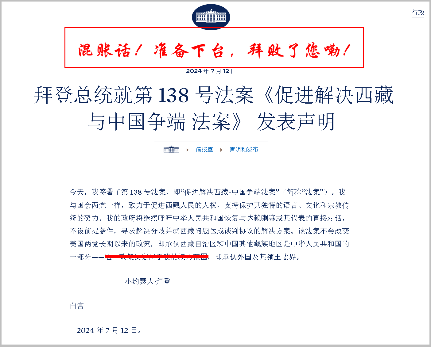 今天,拜登又上演了一幕丑劇,在下臺(tái)前翻箱底找出來個(gè)“西藏法案”,企圖擾亂國際視線,緩解美國選民包括民主黨在內(nèi)呼吁其退選形成的巨大精神壓力,顧左右而言他,拿中國說事,以壯其膽!