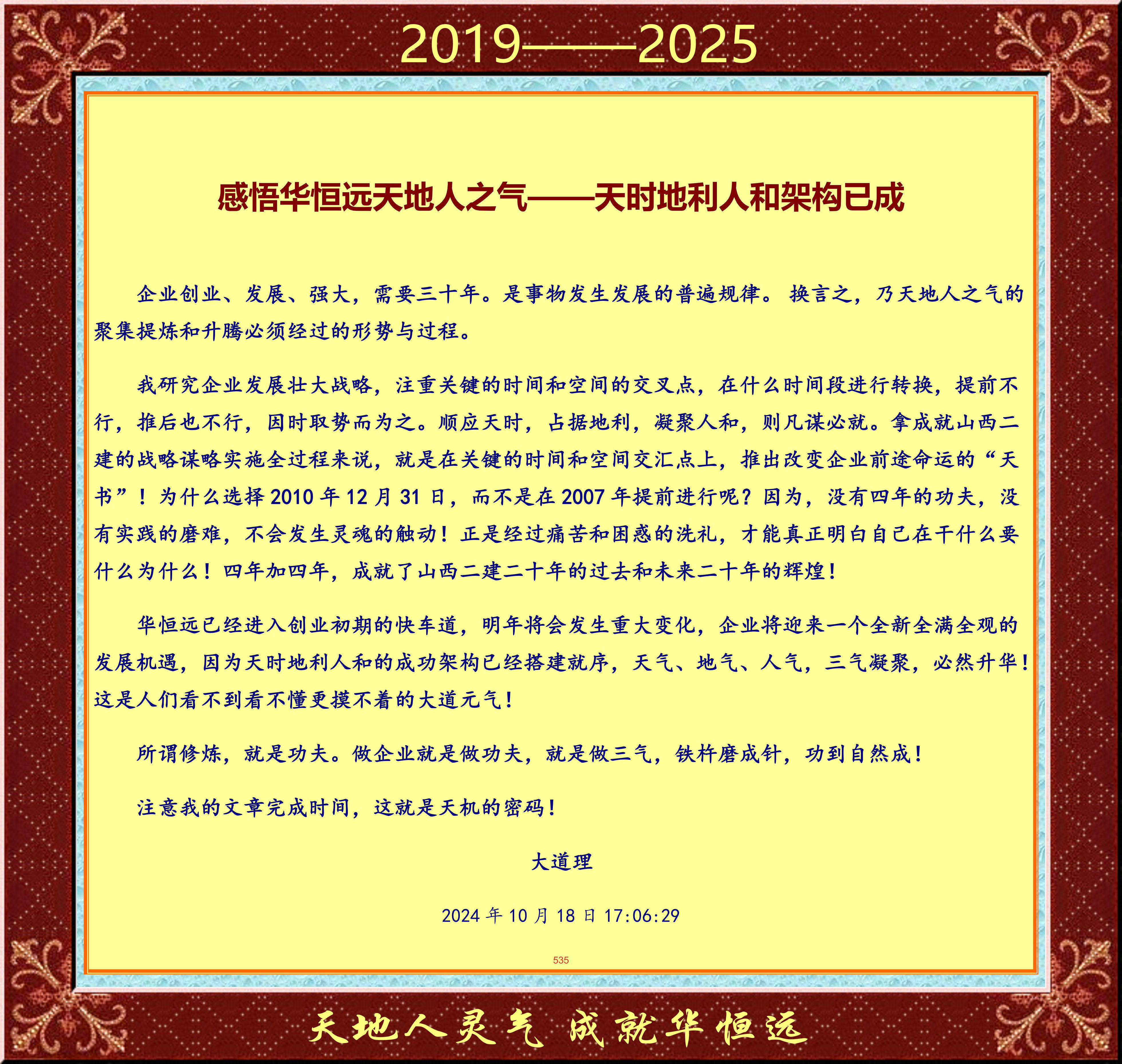 華恒遠(yuǎn)已經(jīng)進(jìn)入創(chuàng)業(yè)初期的快車道,明年將會發(fā)生重大變化,企業(yè)將迎來一個全新全滿全觀的發(fā)展機(jī)遇,因為天時地利人和的成功架構(gòu)已經(jīng)搭建就序,天氣、地氣、人氣,三氣凝聚,必然升華!這是人們看不到看不懂更摸不著的大道元氣!