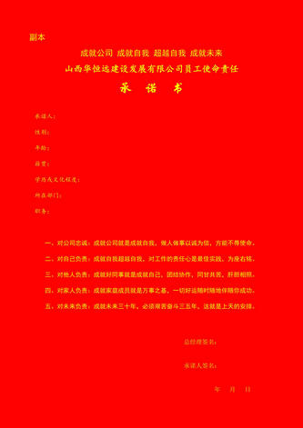 承諾書一式兩份,總經(jīng)理和承諾人各執(zhí)一份,作為對(duì)未來(lái)的承諾和勉勵(lì)!