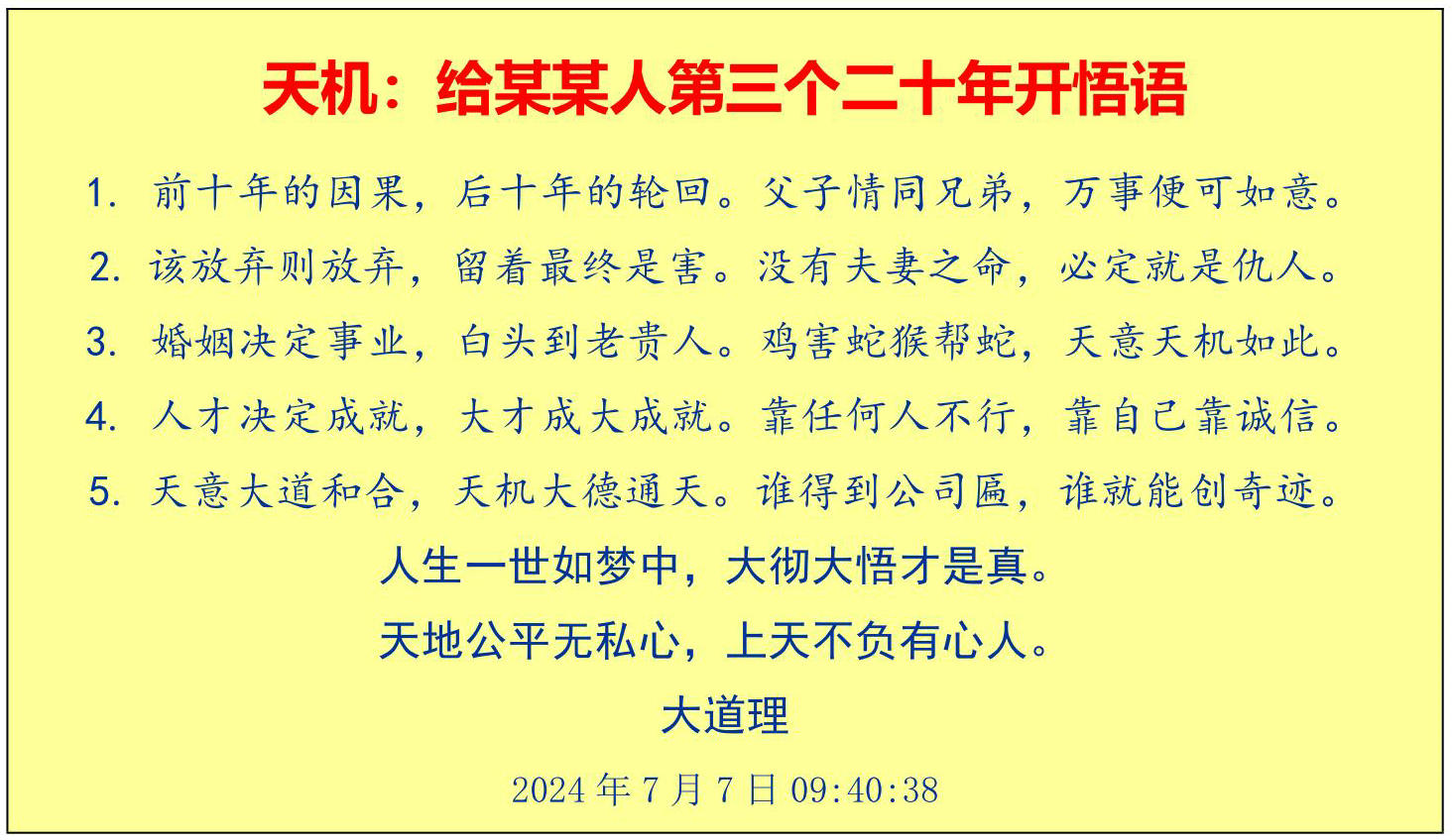 下面兩篇文章,是去年七月七日給決定未來兩個(gè)人的人生命運(yùn)測試題,現(xiàn)在可以公開結(jié)果:拿到賦予“悟之”之人,失去了未來二十年的機(jī)遇,遺憾!拿到賦予“用之”之人,獲得了未來二十年的天機(jī),祝賀!