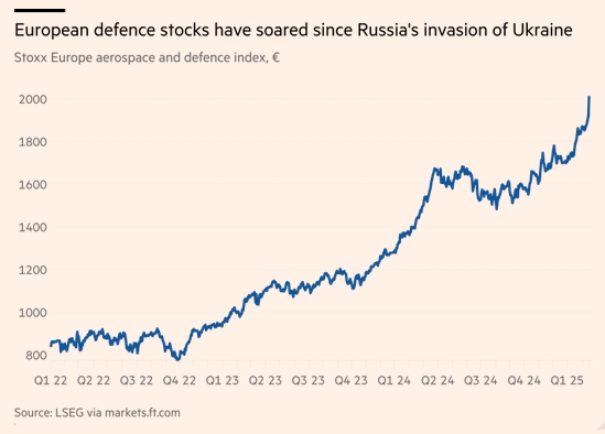 《金融時報》指出,歐盟各國的官方數(shù)據(jù)顯示,從俄烏沖突爆發(fā)前的2021年到爆發(fā)后的2024年,其國防總開支增長超過30%,預計總金額達3260億歐元,約占成員國GDP的1.9%。隨之共同飆升的還有歐洲各大軍火商的股價。報道說,自2022年2月以來,萊茵金屬的股價已上漲近三倍。