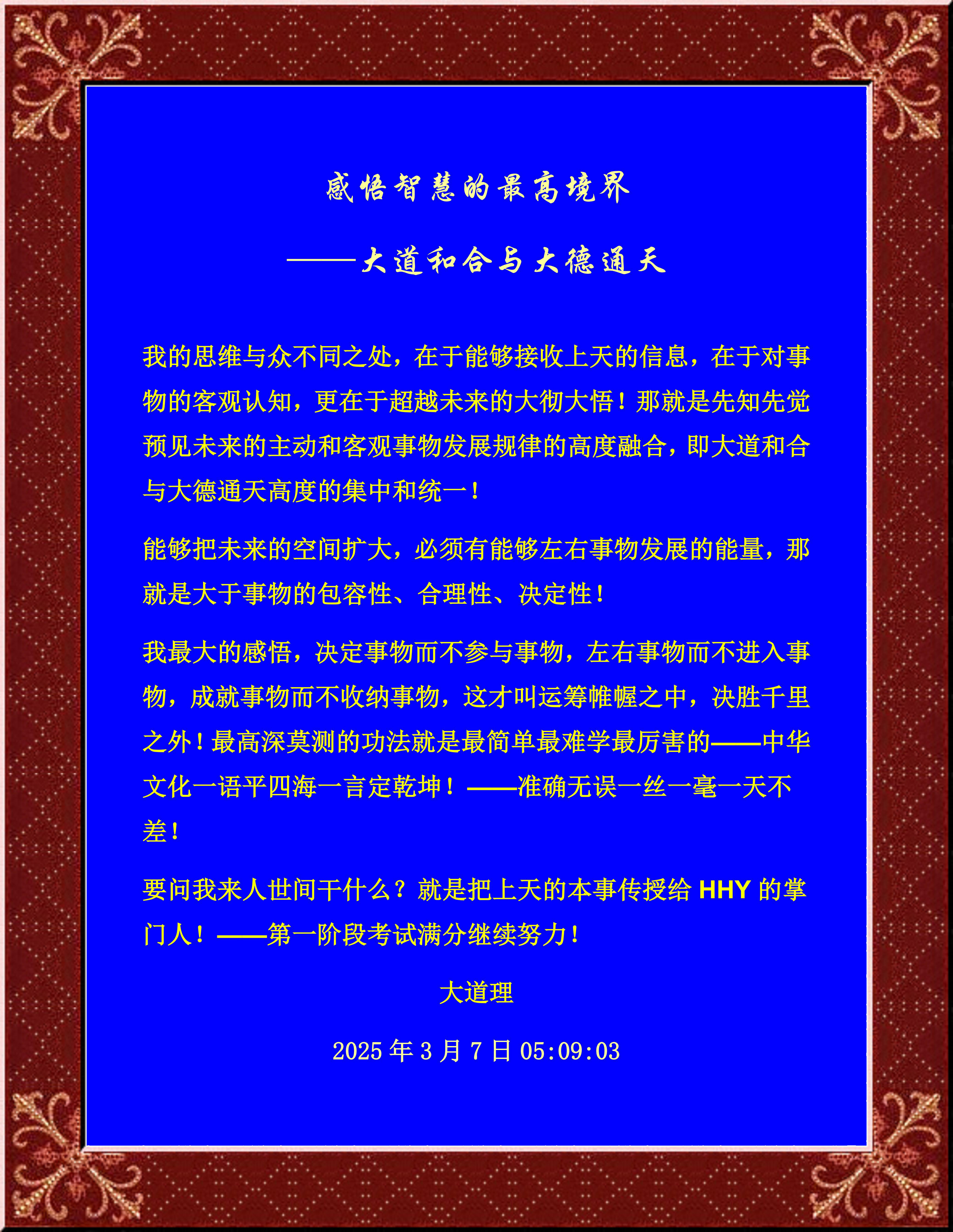 我的思維與眾不同之處,在于能夠接收上天的信息,在于對事物的客觀認知,更在于超越未來的大徹大悟!那就是先知先覺預(yù)見未來的主動和客觀事物發(fā)展規(guī)律的高度融合,即大道和合與大德通天高度的集中和統(tǒng)一!