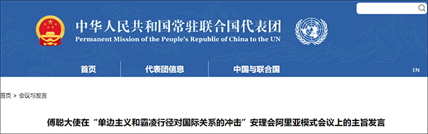 據(jù)中國常駐聯(lián)合國代表團(tuán)網(wǎng)站消息,當(dāng)?shù)貢r(shí)間4月23日,中國常駐聯(lián)合國代表傅聰大使在“單邊主義和霸凌行徑對(duì)國際關(guān)系的沖擊”安理會(huì)阿里亞模式會(huì)議上進(jìn)行主旨發(fā)言。