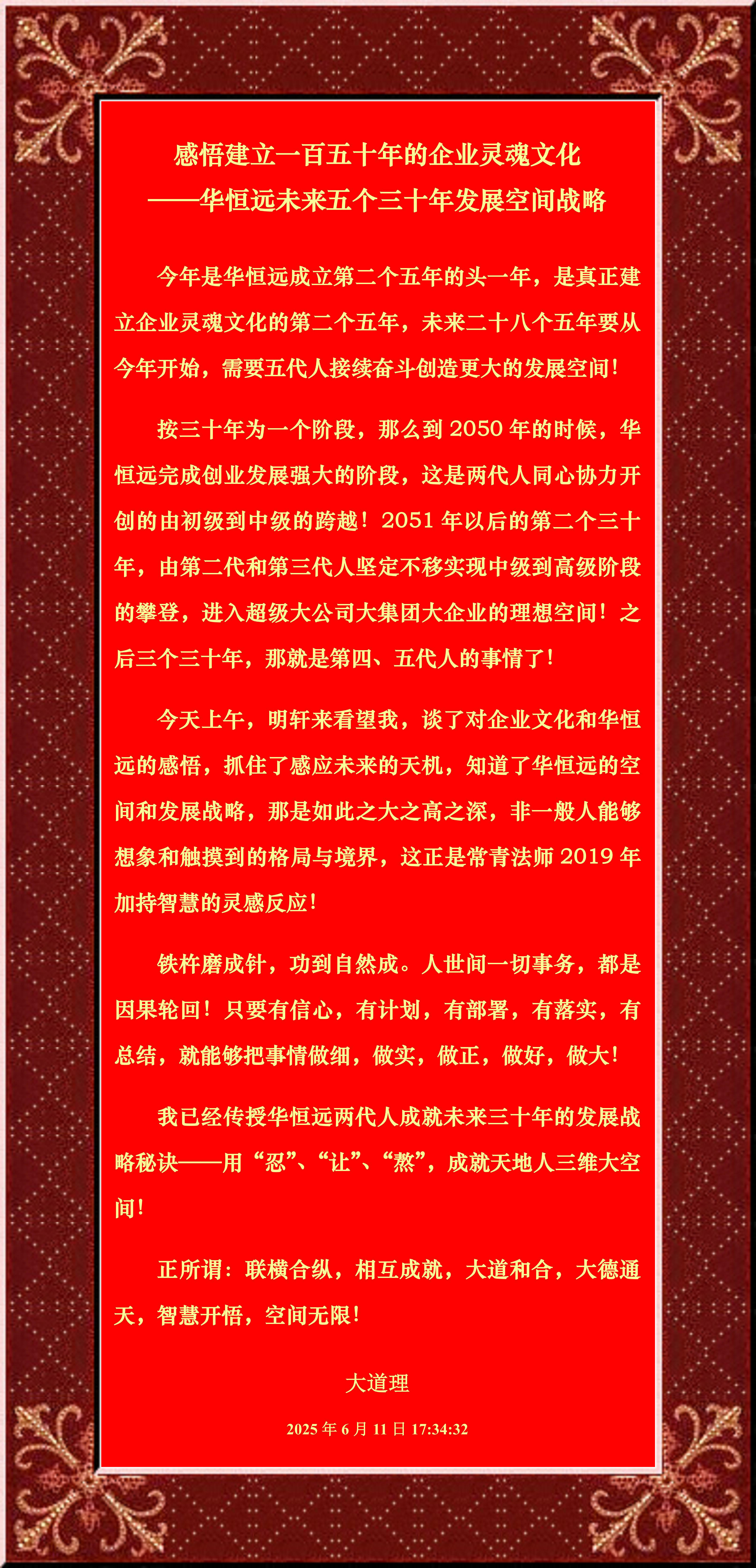 按三十年為一個階段,那么到2050年的時候,華恒遠完成創(chuàng)業(yè)發(fā)展強大的階段,這是兩代人同心協(xié)力開創(chuàng)的由初級到中級的跨越!2051年以后的第二個三十年,由第二代和第三代人堅定不移實現(xiàn)中級到高級階段的攀登,進入超級大公司大集團大企業(yè)的理想空間!之后三個三十年,那就是第四、五代人的事情了!