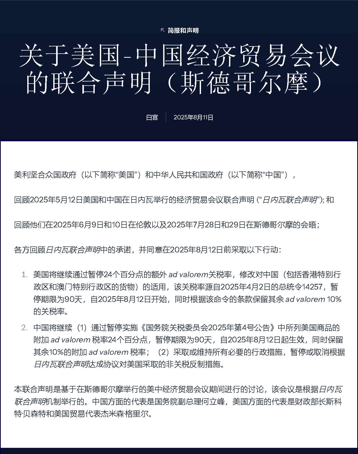 本聯(lián)合聲明是基于在斯德哥爾摩舉行的美中經濟貿易會議期間進行的討論,該會議是根據日內瓦聯(lián)合聲明機制舉行的。中國方面的代表是國務院副總理何立峰,美國方面的代表是財政部長斯科特·貝森特和美國貿易代表杰米森·格里爾。