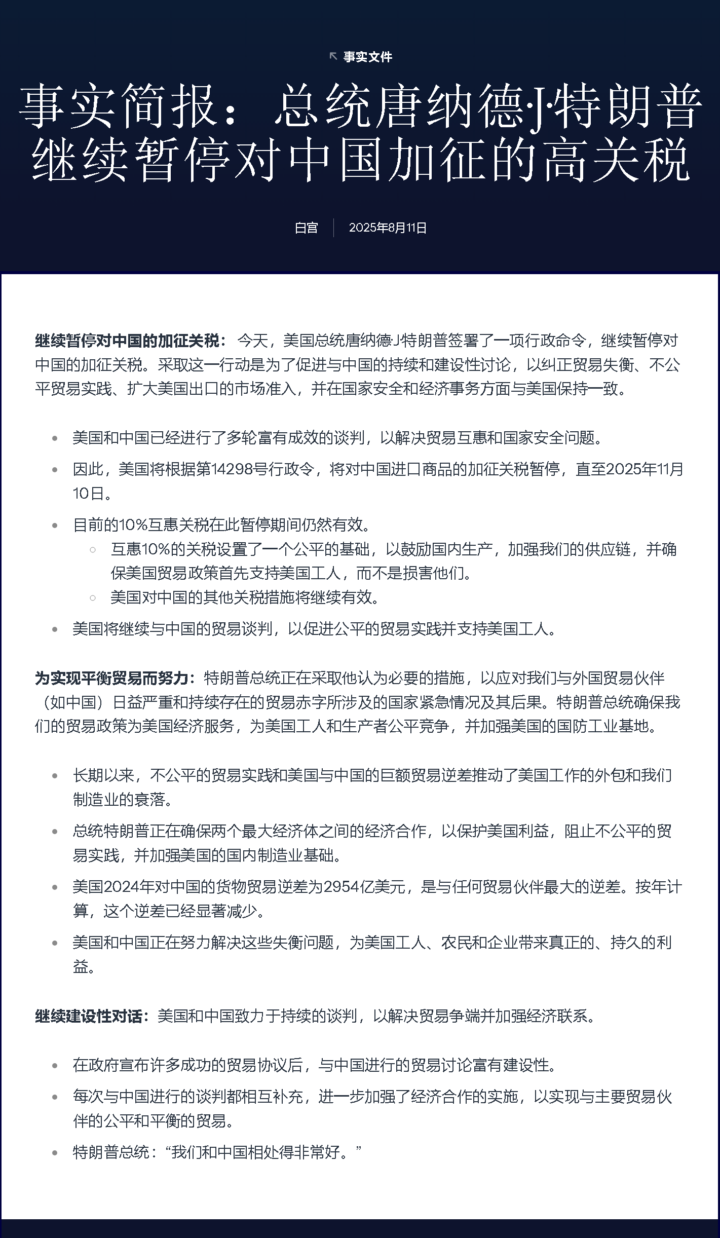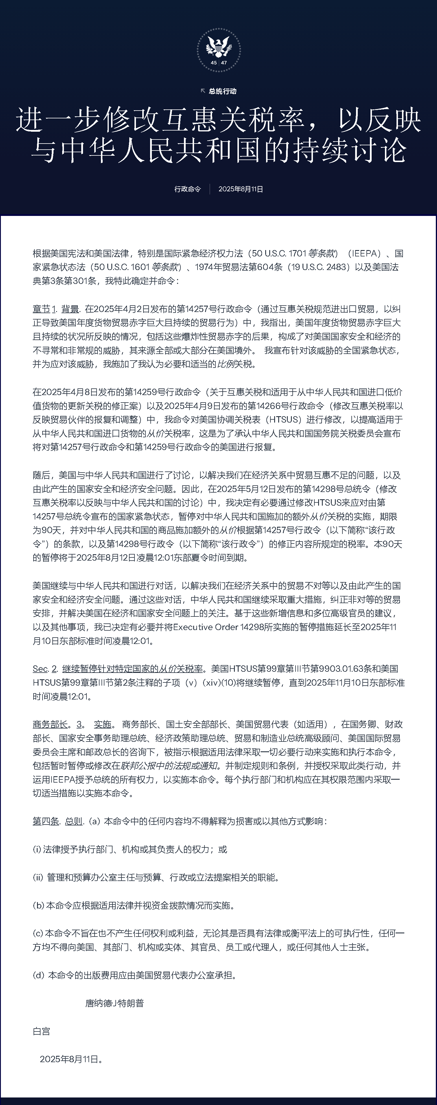 美國繼續(xù)與中華人民共和國進行對話,以解決我們在經濟關系中的貿易互惠性不足問題,以及由此產生的國家安全和經濟安全問題。通過這些對話,中華人民共和國繼續(xù)采取重大措施,糾正非互惠貿易安排,并解決美國在經濟和國家安全問題上的關切?;谶@些新增信息和來自多位高級官員的建議,以及其他事項,我已決定有必要并將Executive Order 14298所實施的暫停措施延長至2025年11月10日東部標準時間凌晨12:01。