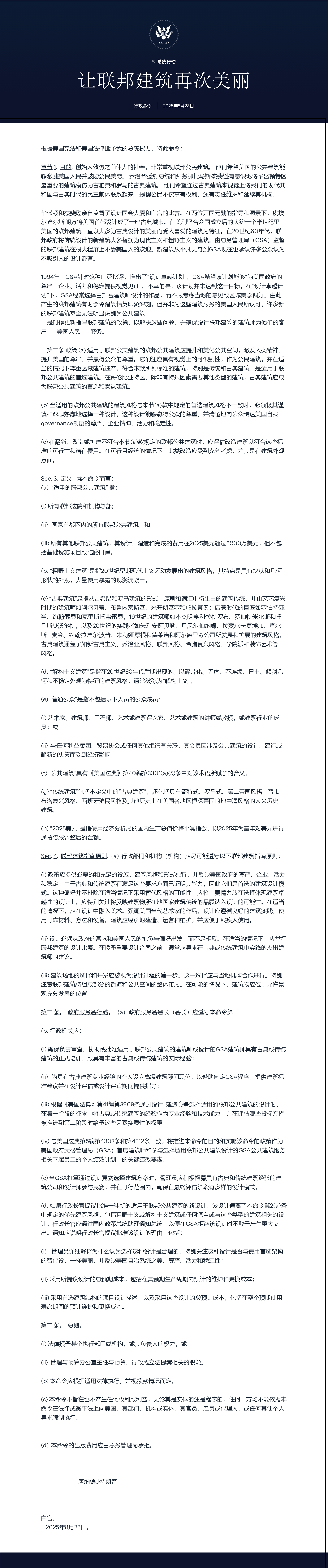 (d) 如果行政長官提議批準(zhǔn)一種新的適用于聯(lián)邦公共建筑的新設(shè)計,該設(shè)計偏離了本命令第2(a)條中規(guī)定的優(yōu)先建筑風(fēng)格,包括粗野主義或解構(gòu)主義建筑或任何源自或與這些類型的建筑相關(guān)的設(shè)計,行政長官應(yīng)通過國內(nèi)政策總統(tǒng)助理通知總統(tǒng),以便在GSA拒絕該設(shè)計時不致于產(chǎn)生重大支出。通知應(yīng)說明行政長官提議批準(zhǔn)該設(shè)計的理由,包括: