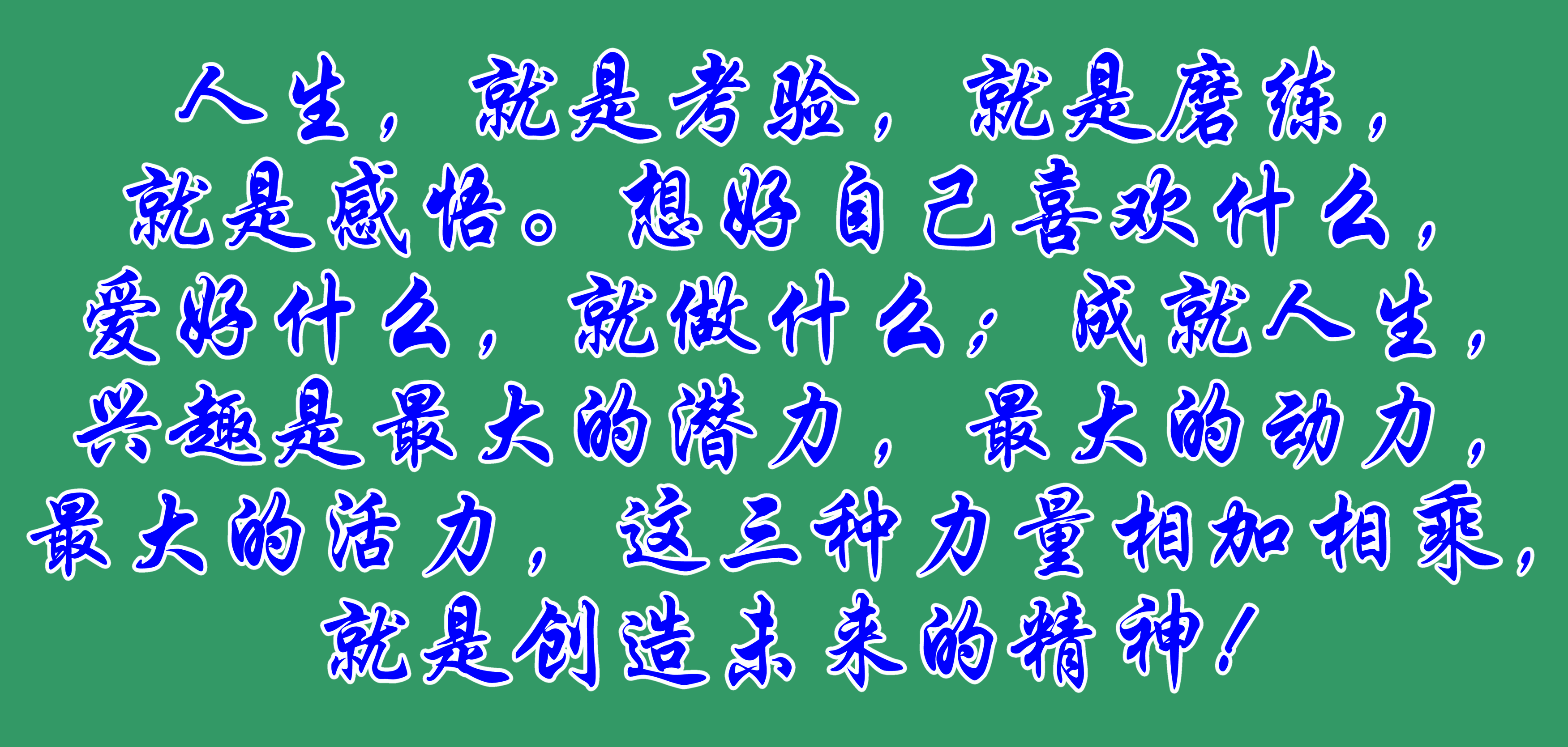 人生,就是考驗,就是磨練,就是感悟。想好自己喜歡什么,愛好什么,就做什么;成就人生,興趣是最大的潛力,最大的動力,最大的活力,這三種力量相加相乘,就是創(chuàng)造未來的精神!