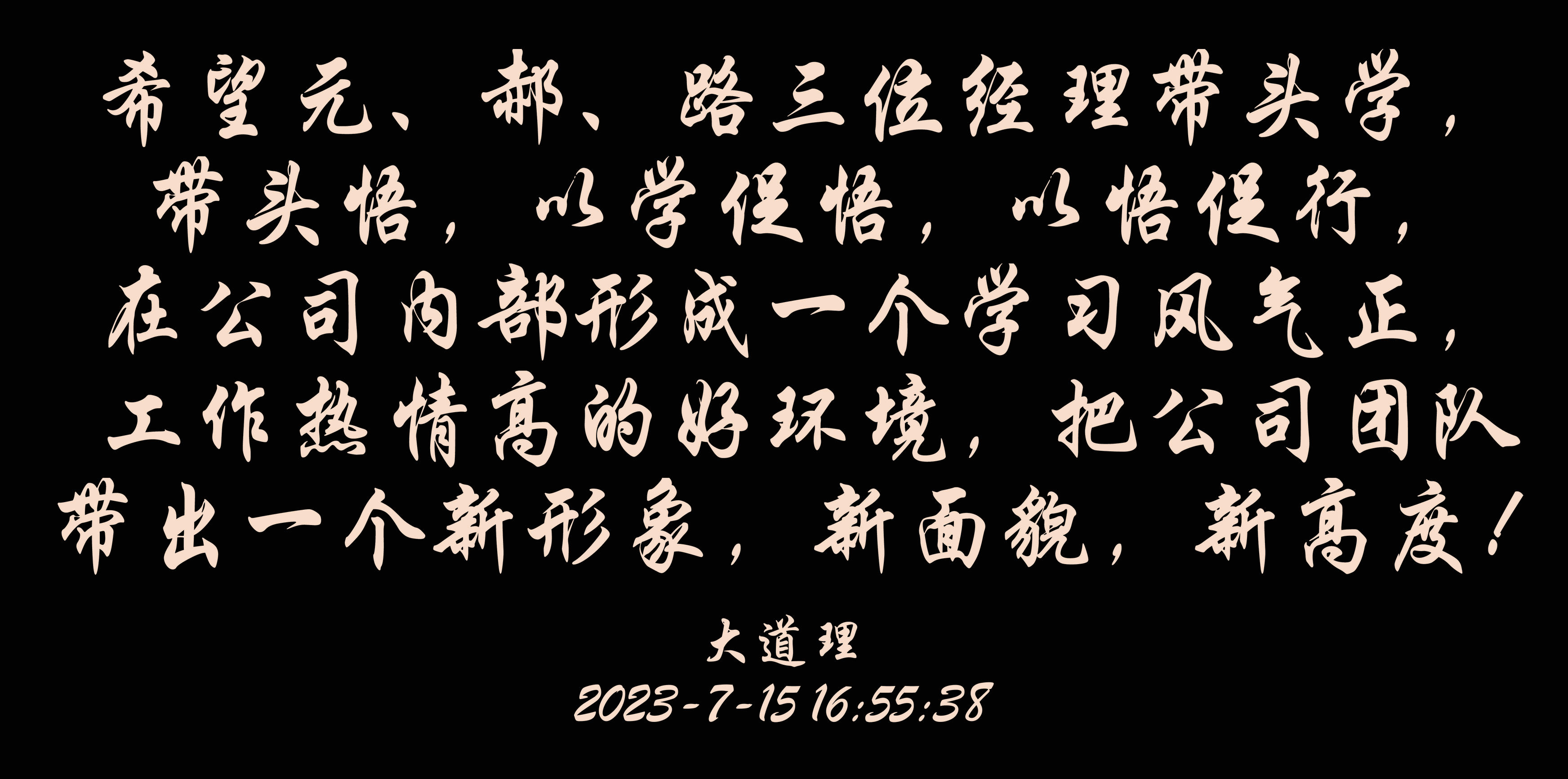認(rèn)真學(xué)習(xí)總書記講話精神,深刻領(lǐng)會講話核心內(nèi)涵和要義,提高理解能力和執(zhí)行能力,把華恒遠(yuǎn)建設(shè)好是學(xué)習(xí)根本要求,希望元、郝、路三位經(jīng)理帶頭學(xué),帶頭悟,以學(xué)促悟,以悟促行,在公司內(nèi)部形成一個(gè)學(xué)習(xí)風(fēng)氣正,工作熱情高的好環(huán)境,把公司團(tuán)隊(duì)帶出一個(gè)新形象,新面貌,新高度!