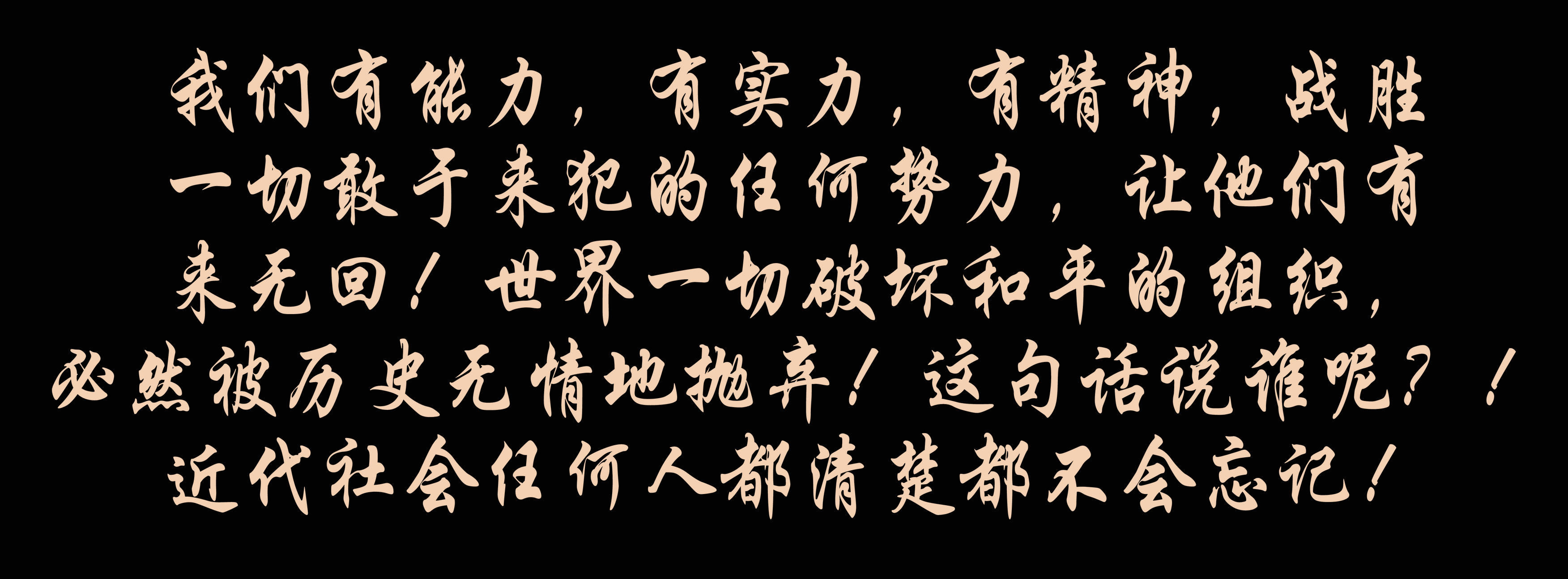我們有能力,有實(shí)力,有精神,戰(zhàn)勝一切敢于來犯的任何勢力,讓他們有來無回!世界一切破壞和平的組織,必然被歷史無情地拋棄!這句話說誰呢?!近代社會任何人都清楚都不會忘記!