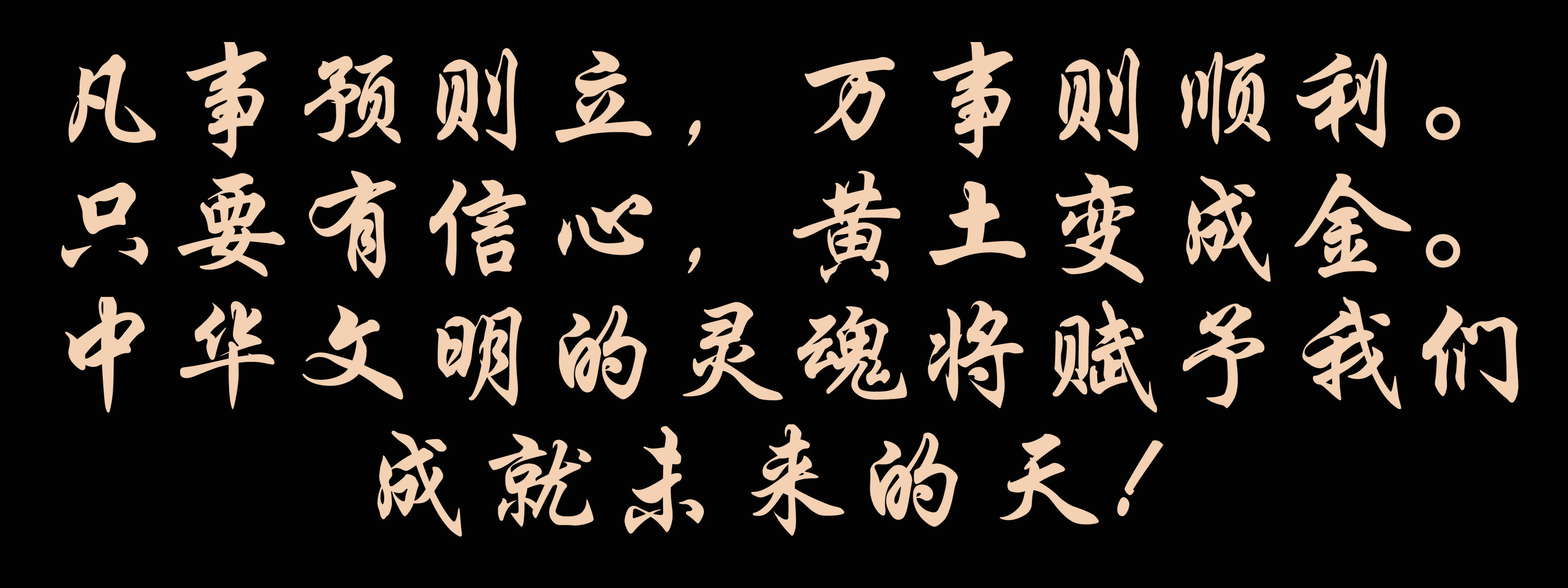 凡事預(yù)則立,萬(wàn)事則順利。只要有信心,黃土變成金。中華文明的靈魂將賦予我們成就未來(lái)的天!