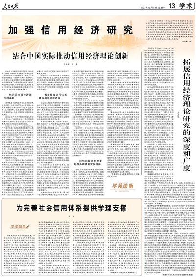 社會主義市場經(jīng)濟是信用經(jīng)濟、法治經(jīng)濟,完善社會信用體系是構(gòu)建高水平社會主義市場經(jīng)濟體制的重要內(nèi)容。黨的二十大報告明確提出:“完善產(chǎn)權(quán)保護、市場準入、公平競爭、社會信用等市場經(jīng)濟基礎(chǔ)制度,優(yōu)化營商環(huán)境?!奔訌娦庞媒?jīng)濟研究,推動信用經(jīng)濟理論創(chuàng)新,對于推進社會信用體系建設、完善市場經(jīng)濟基礎(chǔ)制度、構(gòu)建高水平社會主義市場經(jīng)濟體制具有重要意義。