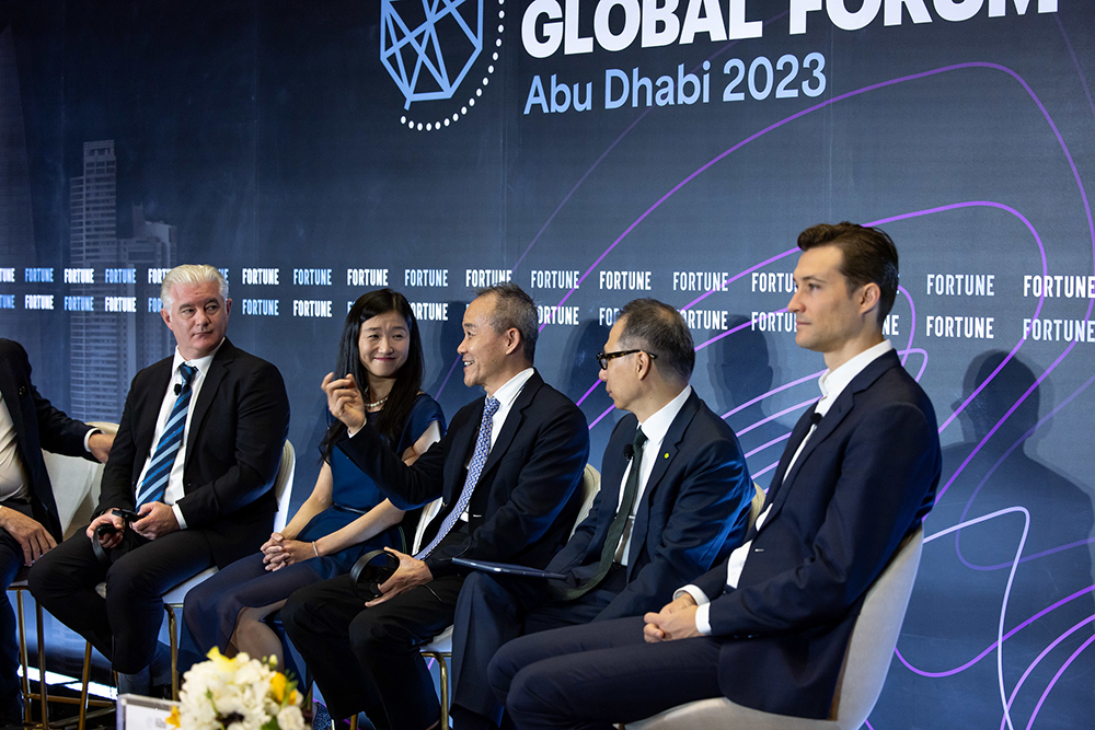 《財(cái)富》全球論壇“展望中國(guó)經(jīng)濟(jì)”圓桌上,五位發(fā)言嘉賓分別是(從左至右):扎耶德大學(xué)政治學(xué)副教授Jonathan Fulton;美國(guó)外交關(guān)系委員會(huì)中國(guó)問(wèn)題研究員劉宗媛;萬(wàn)科企業(yè)股份有限公司董事會(huì)名譽(yù)主席王石;德勤中國(guó)首席執(zhí)行官曾順福;和玉資本(MSA Capital)管理合伙人Ben Harburg