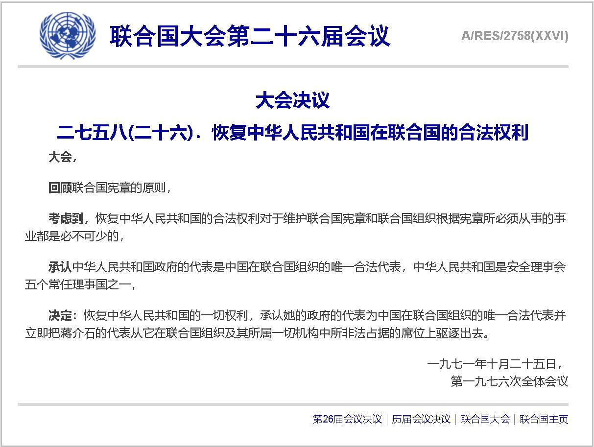 1971年召開的第二十六屆聯(lián)合國大會,是伸張正義的一屆大會。自10月18日起,大會就中國席位問題展開激烈的辯論。10月25日,大會就三個有關中國席位的提案進行表決。