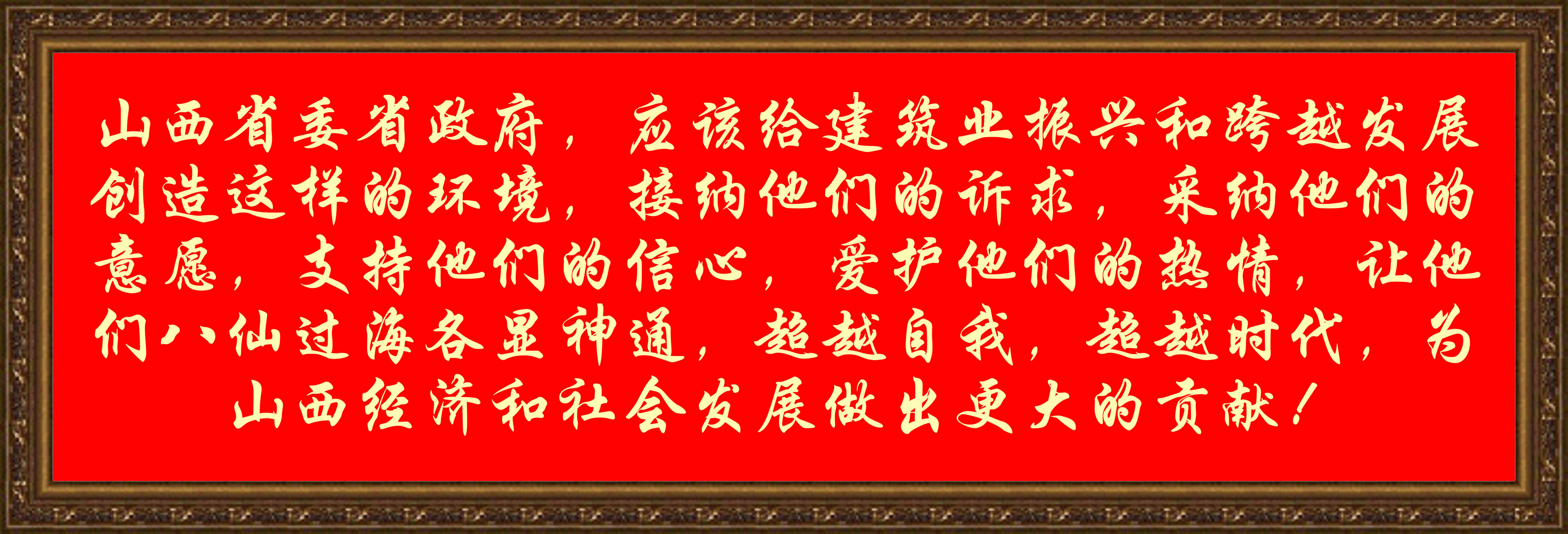 山西省委省政府,應(yīng)該給建筑業(yè)振興和跨越發(fā)展創(chuàng)造這樣的環(huán)境,接納他們的訴求,采納他們的意愿,支持他們的信心,愛護(hù)他們的熱情,讓他們八仙過海各顯神通,超越自我,超越時(shí)代,為山西經(jīng)濟(jì)和社會發(fā)展做出更大的貢獻(xiàn)!