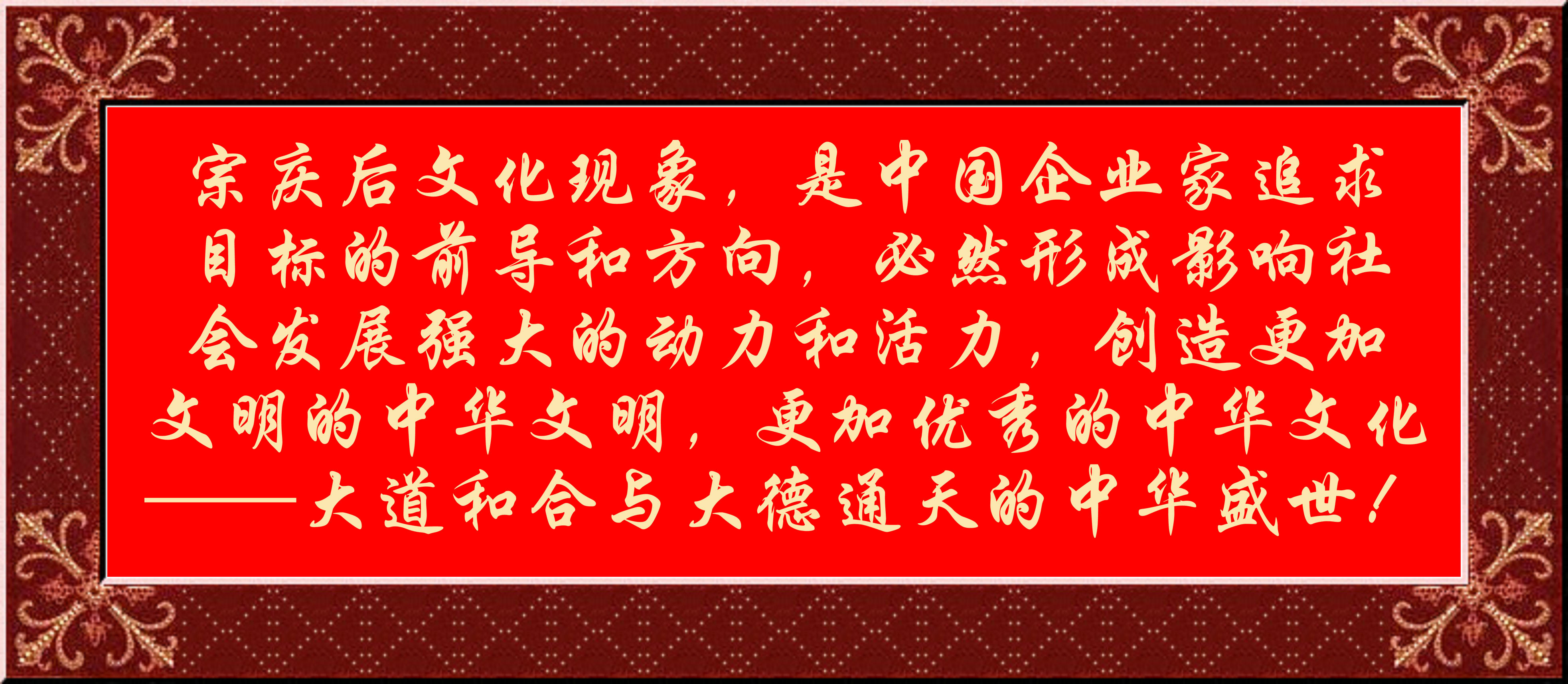 宗慶后文化現(xiàn)象,是中國(guó)企業(yè)家追求目標(biāo)的前導(dǎo)和方向,必然形成影響社會(huì)發(fā)展強(qiáng)大的動(dòng)力和活力,創(chuàng)造更加文明的中華文明,更加優(yōu)秀的中華文化——大道和合與大德通天的中華盛世!