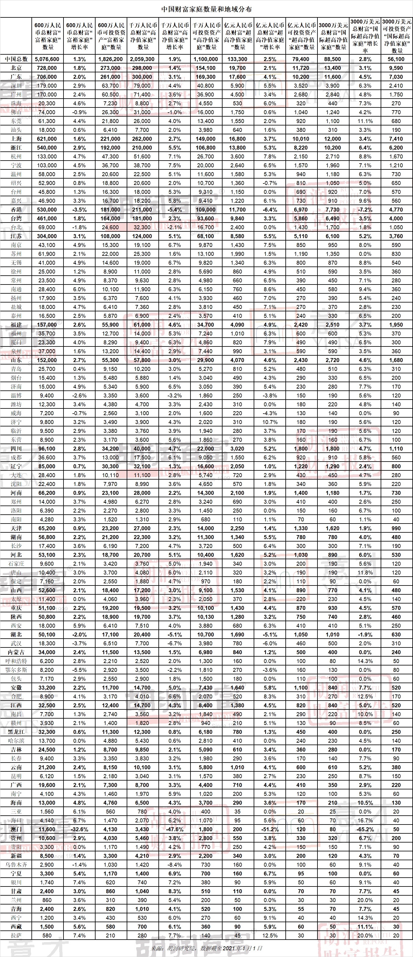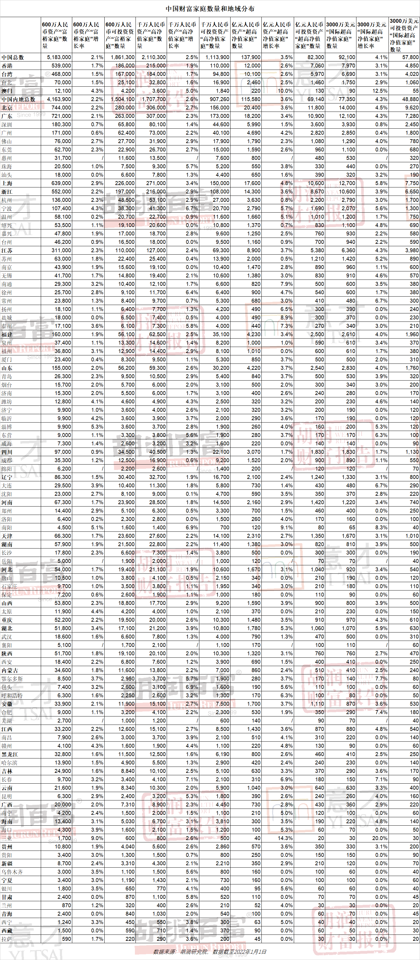 胡潤(rùn)研究院今日發(fā)布《2023胡潤(rùn)財(cái)富報(bào)告》(Hurun Wealth Report 2023)。報(bào)告揭示了目前中國(guó)財(cái)富家庭數(shù)量、地域分布情況以及人群畫(huà)像。這是胡潤(rùn)研究院連續(xù)第15年發(fā)布《胡潤(rùn)財(cái)富報(bào)告》。報(bào)告除了公布中國(guó)擁有600萬(wàn)人民幣、千萬(wàn)人民幣、億元人民幣和3000萬(wàn)美元總財(cái)富的家庭數(shù)量之外,也公布了擁有600萬(wàn)人民幣、千萬(wàn)人民幣、億元人民幣和3000萬(wàn)美元可投資資產(chǎn)的家庭數(shù)量。