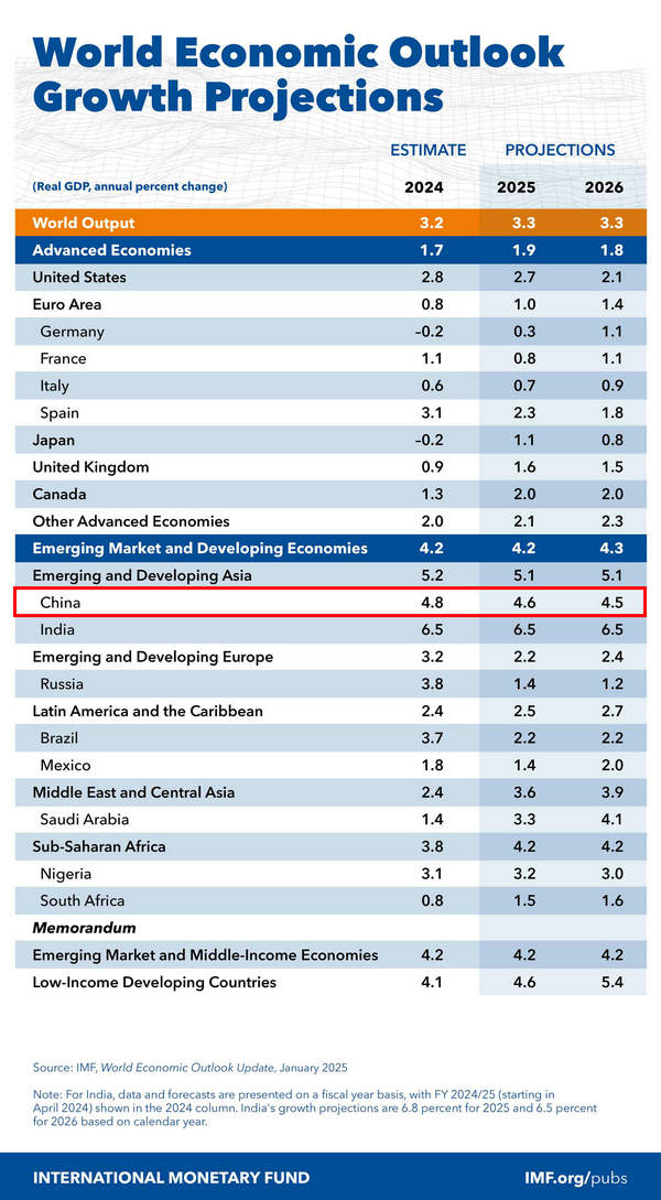 具體來看,發(fā)達經濟體今年預計將增長1.9%,明年預計將增長1.8%。美國和歐元區(qū)經濟預計今年將分別增長2.7%和1.0%,明年將分別增長2.1%和1.4%。新興市場和發(fā)展中經濟體今年預計將增長4.2%,明年將增長4.3%。中國經濟預計今年將增長4.6%,較去年10月預測值高出0.1個百分點;明年預計增長4.5%。